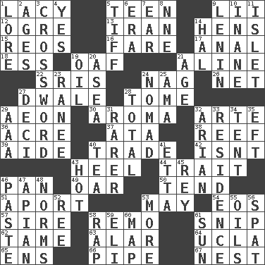ACROSS 1. Made of lace 5. Adolescent 9. Cards in a Roman deck? 12. Legendary monster 13. SW Asia republic 14. Coop moms 15. Vintage cars 16. Conductor's collection 17. Of or related to the anus 18. Double-curved letter 19. Clumsy lout 21. Place in a line 22. Indian titles of respect 24. Tired old horse 26. Fish or hair follower 27. A sleeping potion; an opiate (poet.) 28. Heavy book 29. A really long time 30. Odor 32. Johnson of "Laugh-In" 36. 43,560 square feet 37. _ moment's notice (2 wds.) 38. Coral collection 39. Helper 40. Barter 42. Is not 43. Person who is morally reprehensible 44. Distinguishing feature 46. Baking dish 49. Boat paddle 50. Look after 51. To the left, to Queeg 53. Can I? 54. Greek goddess of the dawn 57. Beget 58. San ____ (Riviera town) 61. Sever or remove by pinching or nipping 62. Docile 63. Having or resembling wings 64. Southern CA. univ. 65. Followers of ems 66. Corncob 67. Egg locale DOWN 1. Old wives' tales, e.g. 2. Grows older 3. What you're doing now 4. Consenting reply 5. Small quarrel 6. Epoch 7. Hearing organ 8. Compass dir. 9. Soviet premier 1918-24 10. Lacking in sense or substance 11. Small island 14. Actor Linden 19. Petroleum 20. Toward the sea 21. Grow older 23. Indian princess (variant) 24. Roamer 25. Housemaid (var.) 27. Tenth: prefix 28. Add up to 29. American Automobile Association (abbr.) 31. More valued for its uncommonness 32. Believer in; advocate of (suffix) 33. Home 34. Portable shelter 35. Newt 40. Beverage made from leaves 41. Singer James 43. Being at a high temperature 45. Marina Del _, California 46. Thick mixture 47. Bee-related 48. Typical models 52. Portuguese money of account (variant) 53. Greater amount 55. Petroleums 56. Petty quarrel 58. Reproach for some lapse or misdeed 59. Biblical high priest 60. Atlas unit 61. Player for Phoenix