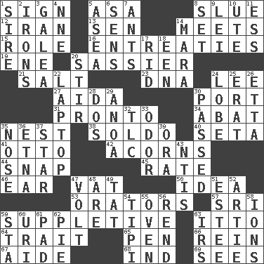 ACROSS 1. Public display of a written message 5. White ___ sheet 8. Change direction abruptly 12. SW Asia republic 13. Elected rep. 14. Confronts 15. Hero or heavy, e.g. 16. Pleas 19. Compass dir. 20. More lively and spirited 21. Table seasoning 23. Heredity factor (abbr.) 24. Area sheltered from the wind 27. Opera by Verdi 30. Left side of a ship or aircraft 31. Right away 34. Blind as ____ 35. Egg locale 38. Twentieth part of a lira 40. Bristle 41. "Beetle Bailey" pooch 42. Oak nuts 44. Fastener 45. Assign a rank or rating to 46. Ewer handle 47. Large container 50. It may be bright or harebrained 53. Speakers 57. _ Lanka 59. Supplementary 63. "Tell ____ the Marines!" 64. Distinguishing feature 65. Writing instrument 66. It's straight from the horse's mouth 67. Assistant 68. Working for oneself (abbr.) 69. Observes DOWN 1. Male parent of an animal 2. Removes the wrinkles 3. An organ shaped like a helmet 4. Compass dir. 5. Toward the sea 6. Elected reps. 7. Pismires 8. Put into a specified state 9. Luau accessory 10. Shoshoni 11. Double-curved letter 14. Hindu Mythology: god of death 17. To free from 18. Car or cant ending 20. Move through with a circular motion 22. Portable computer 24. Ear part 25. Part of Q.E.F. 26. Singer James 28. Two (Sp.) 29. Small Philippine buffalo 30. Went by 32. Affectionate concern, for short 33. Aroma 35. Characteristic smell of wine 36. Inactive volcano in Sicily 37. Play the lead 39. Mouth or opening 43. Nuclear Threat Initiatives 47. Electrical Unit 48. "We ___ not amused" (Victoria) 49. Make lace 51. First name in cosmetics 52. Nick name for Arthur 54. Native american tent (variation) 55. Baking chamber 56. Tear apart 58. Charged particles 59. R.R. building 60. RI univ. 61. Groovy apt. 62. Sliced dessert 63. Big collection agency