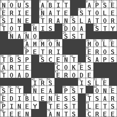 ACROSS 1. Common sense 5. "This won't hurt ____!" 9. Domed church section 13. 4th largest of the Great Lakes 14. Nathan's nickname 15. Took without asking 16. Trig term 17. Interpreter 19. Small child 20. Part of HMS, perhaps 21. ___ good deed 22. Filthy place 23. Billionth: prefix 25. Fast jet (abbr.) 26. ID or VA city 30. Undercover agent 34. _ dish (used to culture cells) 35. Greek god of love 36. Cook's measure (abbr.) 39. Odor 42. Plant excrements 43. Johnson of "Laugh-In" 44. Popular sodas 46. Frog relative 47. Eat (away) 48. Big collection agency 51. Capri or Wright 54. Arrange properly for use 57. Teachers' org. 58. Pacific Standard Time (abbr.) 60. Single 62. The property of being fit to eat 65. Russian ruler of old 66. Abounding in pines 67. Trial 68. Allows 69. Adolescent 70. Pismires 71. Algonquian DOWN 1. A home for chicks 2. Greek mythologigal hunter 3. National forest in Provo, Utah 4. Observe 5. Opposed to 6. Drinking establishments 7. Call ___ day 8. Watches over 9. "One Day ___ Time" 10. Plant holders 11. Notch 12. Suggestive of the supernatural 15. Narrow board 18. Distress signal 20. Residence 24. Slept 27. Mountains (abbr.) 28. The grampus (Milton) 29. Sibling's daughter 30. Makes clutter 31. Mouth or opening 32. Chop off 33. Curvy letter 36. Make lace 37. Sis' sibling 38. R.R. building 40. Or not 41. Ring climax 45. Prepare for publication 48. Inwardly 49. To riddle 50. Before Barbara or Clara 52. Failure 53. Related on the mother's side 54. Back-to-school mo. 55. Singer Brickell 56. Prong on a fork 58. Inconspicuous attention getter 59. Fast planes 61. Celtic language 63. Benjamin's nick name 64. Car or cant ending 65. Affectionate concern, for short