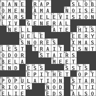 ACROSS 1. Object of repulsion 5. Strike 8. Oscar Madison type 12. Sign of things to come 13. Housemaid (var.) 14. Annoying sound 15. Armed conflicts 16. Household entertainment appliance 19. 54 in ancient Rome 20. Commissioned military rank 21. 1994 drama film starring Jodie Foster 23. Had dinner 24. Part of HMS, perhaps 27. Ubangi River tributary 30. Suggestive of the supernatural 31. Sounds asleep 34. Dec. holiday 35. For fear that 38. Distinguishing feature 40. Is not 41. Aroma 42. Flight of steps 44. Actor Lugosi 45. Rendezvous 46. Conclusion 47. Double-curved letter 50. Fast planes 53. Curse 57. Elect 59. Census information 63. Play the lead 64. Debaucheries 65. Allow head to fall sleepily 66. Jacques of French films 67. Writer Wiesel 68. Begley and Asner 69. In addition DOWN 1. Soup holder 2. At full speed 3. Boldness 4. Followers of ems 5. Assign a rank or rating to 6. So be it 7. Diluted with white 8. Mayday 9. Cards in a Roman deck? 10. Bear (Spanish) 11. Benjamin's nick name 14. Mediterranean tributary 17. Epoch 18. Large container 20. Small, secluded valley 22. A period of five years 24. Folds over and sews together 25. SW Asia republic 26. System (abbr.) 28. Car dealer's back yard 29. Blunders 30. Has an existence 32. Ingest 33. Thailand, formerly 35. Ear part 36. Locale of original sin 37. Exchanged or delivered for money 39. Neckwear 43. Take ten 47. Snakelike fish 48. Health resort 49. Be seated 51. "_____ Recall" 52. Arguments over trivial matters 54. Prong on a fork 55. Parka part 56. Conclusions 58. Musical group of three 59. Before (prefix) 60. Petroleum 61. Luau course 62. Shoshoni 63. R.R. building