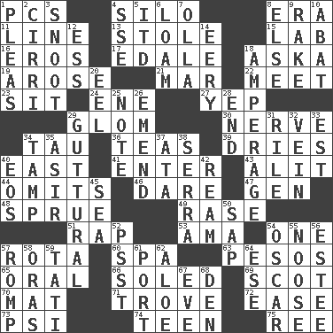 ACROSS 1. Personal Computers (abbr.) 4. Grain storage tower 8. Period 11. Actor's bit 13. Took without asking 15. Experiment locale 16. Greek god of love 17. Peak District village in England 18. "____ silly question..." 19. Came up 21. Spoil 22. Confront 23. Be seated 24. Compass dir. 27. Slangy assent 29. Take by theft 30. Boldness 34. The 19th letter of the Greek alphabet 36. Beverages made from leaves 39. Frees from moisture 40. 90 degrees 41. Keyboard key 43. Came down and settled, as after flight 44. Leaves out 46. Have the gumption 47. Commissioned mil. rank 48. Disorder 49. Raze (variant) 51. Reproach for some lapse or misdeed 53. Housemaid (var.) 54. Single 57. Roll call or roster of names 60. Health resort 63. Mexican monetary units 65. Relating to the mouth 66. Having a sole or soles 69. Highlander 70. Floor covering 71. Collection of objects 72. Relaxation 73. 23rd letter of the Greek alphabet 74. Adolescent 75. To separate or throw off DOWN 1. Entreaties 2. High-altitude cloud 3. Snob 4. Compass dir. 5. It would 6. Rich soil 7. Water jar 8. Otherwise 9. Libertine 10. Blind as ____ 12. Curvy letter 14. Suggestive of the supernatural 18. Electrical Measurement 20. Snakelike fish 25. Observe 26. Make improvements or corrections to 28. Conclude 29. From the throat 31. Cause heat under the collar 32. Distinctive style or manner 33. Eastern Standard Time (abbr.) 34. Pack (down) 35. SW Saudi Arabia district 37. _ moment's notice (2 wds.) 38. Father Junipero _ 40. Greek goddess of the dawn 42. 480, 500 or 516 sheets of paper 45. Ocean 50. Plant excrement 52. Inconspicuous attention getter 54. Witty Wilde 55. Trap for birds or small mammals 56. First name in cosmetics 57. Play 58. Mouths or openings 59. Jacques of French films 61. Sweet dark-red dessert wine 62. _ vera 64. Compass dir. 67. First lady 68. Lair