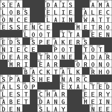 ACROSS 1. Ocean 4. Raised platform 8. Wet nurse (var.) 11. Tennis shots 13. Writer Wiesel 14. Actor Baldwin 15. At one time in the past 16. (Had) reclined 17. Electrical Unit 18. Substance 21. Paris' subway 22. Plunder 23. Call ___ day 25. Car or cant ending 26. Begley and Asner 29. Orators 32. Sibling's daughter 34. Cooking vessel 35. Small child 38. Letter starter 39. Heavy duty weighing machine 41. The sixth month of the Jewish calendar 43. Medical imaging device (abbr.) 44. Ewer handle 45. U. of Maine site 46. Sass 50. 17th letter of the Greek alphabet 51. Health resort 54. A female animal or person 55. Drug cop 57. Columnist Joseph or Stewart 59. Glorified 63. For fear that 64. Burn to charcoal 67. Suggestive of the supernatural 68. Collude with 69. Mild oath, euphamism for damn 70. Count _ (2 wds.) 71. Lair 72. Kill 73. Born DOWN 1. A type of plum 2. Immeasurably long periods of time 3. Lettered men learn these first 4. Erase 5. According to 6. One more than two 7. Elected rep. 8. Having winglike extensions 9. Distance measurement (Brit.) 10. Gambison 12. Stitch closed the eyes of (a falcon) 14. Deep reverence 19. Characteristic smell of wine 20. Police officer (slang) 21. Spoil 23. Picture 24. False hair 26. Conclusion 27. South Vietnam president (1954) 28. Scorch 30. To the left, to Queeg 31. Play the lead 33. Baby bed with high sides 36. Scent 37. Hyperbolic tangent 39. Technology 40. Libertine 42. Friend of Pooh 45. Gumbo ingredient 47. Cleo's killer 48. Disorder of the immune system 49. Not strict 51. Vegetable dish 52. Cadet 53. NE Netherlands city 56. Clement's nick name 58. Baseball player Mel 60. Adolescent 61. 4th largest of the Great Lakes 62. Centimeter-gram-second unit of force 64. Music discs 65. Actor Linden 66. Santa ___, CA