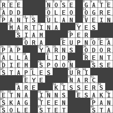 ACROSS 1. To sift 4. Sense of smell 8. Yard entry 12. Find the sum of 13. Margarine 14. Legendary monster 15. Leg coverings 18. Uhlan (variant) 19. Distinctive style or manner 20. Chrissie's court nemesis 22. It is so 23. Thailand, formerly 24. For each 25. Mouth or opening 26. Normal relaxed breathing 30. Infant food 33. Entertaining tales 36. Scent 37. Silent film actress Nazimova 39. Hat (slang) 40. Monthly bill 41. South Vietnam president (1954) 42. Soup utensil 44. Compass dir. 45. Paper fasteners 47. RI univ. 50. Sight organ 51. Drug cop 53. "We ___ not amused" (Victoria) 54. Smoochers 57. Inactive volcano in Sicily 59. Restaurants 61. 1973 Nobel Price Winner (Physics) Leo 63. Heroin 64. Adolescent 65. Baking dish 66. Not divided or shared with others 67. Proofreading order 68. R.R. building DOWN 1. Hit sharply and swiftly 2. Dutch treat 3. Ferber et al. 4. Part of speech 5. Water jar 6. Ocean 7. Age 8. State head 9. Ripens 10. Three (prefix) 11. Car or cant ending 16. Musical group of three 17. Play the lead 21. "If ____ say so..." 22. Slangy assent 24. Suppuration 26. Inside; within (prefix) 27. Lyric poems 28. Immeasurably long periods of time 29. Johnson of "Laugh-In" 30. Writing tablets 31. Came down and settled, as after flight 32. Entreaty 34. High mountains 35. River (Sp.) 38. Electrical Measurement 42. Observe 43. Religious women 46. Potassium hydroxide 48. To erase 49. Angers 52. Dice game 53. Of or related to the anus 54. Leg joint 55. Is not 56. Three-handed card game 57. Double-curved letter 58. Ring climax 59. It is 60. Fish or hair follower 62. _ tizzy (2 wds.)