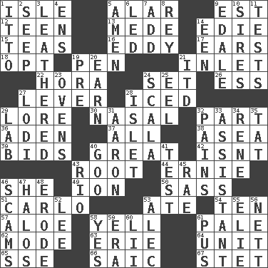 ACROSS 1. Capri or Wright 5. Having or resembling wings 9. Eastern Standard Time (abbr.) 12. Adolescent 13. Ancient Persian 14. Singer Brickell 15. Beverages made from leaves 16. Whirlpool 17. Hearing organs 18. Choose 19. Writing instrument 21. An arm off of a larger body of water 22. Israeli folk dance 24. Arrange properly for use 26. Double-curved letter 27. Prying instrument 28. On the rocks 29. Old wives' tales, e.g. 30. Relating to the nose 32. Role in a play 36. An important port of Yemen 37. Everything 38. Toward the sea 39. Auction offers 40. Relatively large 42. Is not 43. Carrot, for example 44. Bert's buddy 46. A female animal or person 49. Electrically charged atom 50. Backtalk 51. Monte _, Las Vegas Hotel/Casino 53. Had dinner 54. "___ Little Indians" 57. Medicinal plant 58. Shout 61. Diluted with white 62. Method 63. 4th largest of the Great Lakes 64. A single undivided whole 65. Compass dir. 66. Ketch in the Levant 67. Proofreading order DOWN 1. "Tell ____ the Marines!" 2. Ooze 3. Tough but pliablecoriaceous 4. Followers of ems 5. So be it 6. Directed 7. Say or write further 8. Marina Del _, California 9. Peak District village in England 10. Titles for men of rank and authority 11. Trials 14. Car or cant ending 19. Before (prefix) 20. Merit 21. It would 23. Baking chambers 24. Any of the three canals of the cochlea 25. Snakelike fish 27. Farming town in central California 28. Small island 29. Experiment locale 31. Composer Copland 32. Aches 33. Helper 34. French philosopher Descartes 35. Make lace 40. Thick or sticky substance 41. Trial 43. _ de Janeiro 45. Actress Charlotte 46. Fraudulent business schemes 47. Auras 48. Wear away 52. Area sheltered from the wind 53. Actor Baldwin 55. Writer Wiesel 56. Remaining after all deductions 58. Consenting reply 59. Epoch 60. Cards in a Roman deck? 61. Suppuration