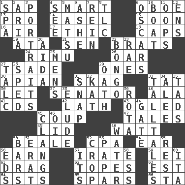 ACROSS 1. Plant excrement 4. Don Adams' spy role 9. Mitch Miller's instrument 13. Adept person 14. Artist's stand 15. Within a short period 16. Atmosphere 17. Principle of right and wrong 18. Smile enhancers 19. _ moment's notice (2 wds.) 21. Elected rep. 22. Naughty children 24. Tall New Zealand timber tree 26. Rowing implement 27. Sadhe (variant) 29. Washington bills 30. Bee-related 31. Heroin 33. Make lace 36. Allow 37. Legislator 40. Wing 41. Music discs 42. Thin strip of wood or metal 43. Stared 45. Overturn; upset 47. Stories 48. Hat (slang) 49. Electrical Unit 50. Memphis, Tenn. Street 52. Tax preparer (abbr.) 54. Hearing organ 56. Merit 57. Feeling or showing extreme anger 59. Luau accessory 61. To trail on the ground 62. Drinks excessively 63. Eastern Standard Time (abbr.) 64. Fast planes 65. Practice fights 66. R.R. building DOWN 1. Health resort 2. Roberta Peters solo 3. Likenesses of persons 4. Perceive with the eye 5. Taiwanese island in East China Sea 6. American tennis player Robert 7. It's straight from the horse's mouth 8. Affectionate concern, for short 9. Motion picture awards 10. Water vessel 11. I made a mistake 12. Followers of ems 20. Opera by Verdi 22. Beat drum 23. Actress Charlotte 25. Not women's 27. Baby powder 28. Moved rapidly 29. Pledge 31. Fastener 32. Krazy ___ of comics 33. Baron Munchausen's specialties 34. Toward shelter 35. Small boys 38. Dodge 39. Roll call or roster of names 44. Yard entry 45. Rings like a ship's bell 46. Lubricate 49. Wetness 50. Long, evenly shaped pieces 51. Part of Q.E.F. 52. Riding implement 53. Dad 55. Take ten 56. Begley and Asner 57. ___ a Wonderful Life 58. Curvy letter 60. Call ___ day
