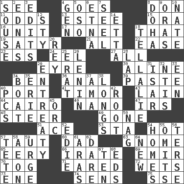 ACROSS 1. Perceive with the eye 4. Travels 8. Spanish title 11. Likelihood 13. First name in cosmetics 15. Mouth or opening 16. A single undivided whole 17. Music written for nine 18. Not this but _ 19. Man with strong sexual desires 21. Keyboard modifier key 22. Relaxation 23. Curvy letter 24. Snakelike fish 27. Everything 29. Jane of fiction 30. Place in a line 34. Benjamin's nick name 36. Of or related to the anus 39. Thick mixture 40. Left side of a ship or aircraft 41. Southeast Indonesia island 43. (Had) reclined 44. Capital of Egypt 46. Billionth: prefix 47. Big collection agency 48. Guide 49. Went 51. Adept person 53. R.R. building 54. Being at a high temperature 57. Drawn tight 60. June honoree 63. Dwarf 65. Suggestive of the supernatural 66. Feeling or showing extreme anger 69. Independent ruler or chieftain 70. Coat; cloak 71. Having ears or earlike features 72. Soaks 73. Compass dir. 74. Elected reps. 75. Compass dir. DOWN 1. Lush 2. Ferber et al. 3. Proofreads 4. Commissioned military rank (abbr.) 5. Bear (Spanish) 6. Inactive volcano in Sicily 7. Stitch closed the eyes of (a falcon) 8. Capital of the state of Qatar 9. Mouths or openings 10. Nathan's nickname 12. Filthy place 14. Singer James 18. Copy Pinocchio 20. Marina Del _, California 25. Part of Q.E.F. 26. Soviet premier 1918-24 28. Infant locale 29. Plea 31. Austrian river, tributary to the Danube 32. Nuclear Threat Initiatives 33. Car or cant ending 34. Water vessel 35. One of the Great Lakes 37. Nursemaid (var.) 38. Yearns 40. Personal Computers (abbr.) 42. Carrot, for example 45. The grampus (Milton) 50. Tired old horse 52. Singer Brickell 54. Dwellings 55. Leaves out 56. Laconic 57. False hair 58. Period of immesurable duration 59. Goad 61. Ancient river in northeast Turkey 62. Have the gumption 64. ___ Haven, CT 67. "___ Little Indians" 68. Begley and Asner