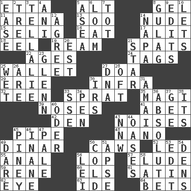 ACROSS 1. Singer James 5. Keyboard modifier key 8. Set 11. Sports stadium 13. "Barney Miller" actor Jack 14. Unadorned 15. Former Milwaukee Brewers owner Bud 16. Ingest 17. Came down and settled, as after flight 18. Snakelike fish 19. 480, 500 or 516 sheets of paper 21. Arguments over trivial matters 22. Ripens 24. Labels 25. Place for singles 27. ___ good deed 29. One of the Great Lakes 30. Kind of red light 32. Adolescent 33. Small fatty European fish 35. Wise men 39. Olfactory organs 41. Collude with 42. Lair 43. Annoying sounds 45. Corncob 48. Billionth: prefix 49. Middle Eastern gold or silver currency 50. Crow sounds 52. Directed 55. Of or related to the anus 56. Trim (branches) 57. Dodge 59. French philosopher Descartes 60. Raised railways 61. Smooth fabric 62. Sight organ 63. Binary compound 64. Stakes DOWN 1. Relaxation 2. Woody plant 3. Copy Pinocchio 4. Cuckoo 5. Toward the sea 6. Rich soil 7. Small child 8. Russian prison camp 9. Proofreads 10. Allows 12. Match 14. California wine valley 20. Eastern Standard Time (abbr.) 21. Play the lead 23. American astronaut and politician John 25. Soggy 26. "We ___ not amused" (Victoria) 27. Heredity factor (abbr.) 28. Often (poetically) 30. Big collection agency 31. At full speed 33. Compass dir. 34. Animal enclosure 36. Utter; complete 37. Unit of force equal to gravity 38. ___ a Wonderful Life 40. River in Europe 43. Compass dir. 44. Fertile tracts in a desert 45. Abounding in pines 46. Silly 47. Light colored 49. Have the gumption 50. Lacking warmth 51. Domed church section 53. Prepare for publication 54. Cub Scout units 56. Luau accessory 58. Experiment locale