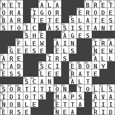 ACROSS 1. Was introduced to 4. Chicken ___ king 7. Cy Young winner Saberhagen 11. Mouth or opening 12. Composer Stravinsky 13. Wear away 14. Drinking establishment 15. Wig 16. Chalkboards 17. Unemotional 19. Helper 21. A female animal or person 23. Eons 24. Soared 25. The 18th letter of the Arabic alphabet 26. Lyricist Gershwin 29. Honkers 30. Raised railways 31. ___ Haven, CT 32. "We ___ not amused" (Victoria) 33. Big collection agency 34. Everything 35. Bit 36. _-fi 37. Black 40. Curvy letter 41. Area sheltered from the wind 42. Pace 43. Examine minutely or intensely 45. The first octave above the treble staff 46. Determination 51. For Whom the Bell _____ 55. Foolish or stupid persons 56. Atlas contents 58. Actress Gardner 59. Having high moral qualities 60. Singer James 61. One more than two 62. Celtic language 63. Teachers' org. 64. To free from DOWN 1. Crowds into 2. Part of Q.E.F. 3. Pacific island yam 4. Mature 5. Globular water bottle used in Asia 6. Ancient Greek god of war 7. Naughty children 8. Roll call or roster of names 9. Genesis locale 10. Trial 12. Irritating cutaneous sensations 13. Otherwise 16. Omens 18. Small island 20. Moves on water 22. She-sheep 24. Eats 25. Nest on high 26. Empty; void 27. Have confidence or faith in 28. Leather borer 29. Pate de foie ____ 32. Had dinner 33. Ancient Celtic tribe of eastern Britain 36. Narrow boards 37. Epoch 38. Greek mezzo-soprano Agnes 39. Von Bismarck 43. Fur scarf 44. Quote 46. Trig term 47. Scent 48. Chest bones 49. Sign of things to come 50. Nathan's nickname 52. Den 53. 57 in ancient Rome 54. Expressed in words 57. Parent Teacher Association (abbr.)
