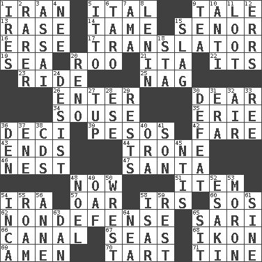 ACROSS 1. SW Asia republic 5. Slanted text style (abbr.) 9. Lie 13. To erase 14. Not wild 15. Sir (Sp.) 16. Celtic language 17. Interpreter 19. Ocean 20. Friend of Pooh 21. Call ___ day 22. It is 23. Travel on or in a vehicle 25. Tired old horse 26. Keyboard key 30. Letter starter 34. Lush 35. One of the Great Lakes 36. Tenth: prefix 39. Mexican monetary units 42. Conductor's collection 43. Extremities 44. Marketplace scale 46. A home for chicks 47. Before Barbara or Clara 48. Immediately 51. A distinct part 54. Lyricist Gershwin 57. Rowing implement 58. Big collection agency 60. Mayday 62. Unrelated to defense, as in spending 65. Indian skirt 66. Lessep's creation 67. Oceans 68. Picture 69. So be it 70. Small pie 71. Prong on a fork DOWN 1. Angers 2. More uncommon 3. Slender Brazilian palm 4. Born 5. "Tell ____ the Marines!" 6. Edible starchy tuberous root 7. Nanny (var.) 8. Soviet premier 1918-24 9. Afternoon social gathering 10. Opposed to 11. Spoils 12. Blunders 15. Volcanic refuse 18. R.R. building 20. Former U.S. Attorney General Janet 24. Stop 27. Uncastrated adult male sheep 28. Compass dir. 29. Musical pauses 30. Outscore 31. Epoch 32. Atmosphere 33. Portuguese money of account (variant) 36. Lair 37. Compass dir. 38. Music discs 40. Mouth or opening 41. Male offspring 45. Nuclear Threat Initiatives 48. Christmas carol 49. Clumsy lout 50. Obtain by seizing forcibly or violently 52. 1973 Nobel Price Winner (Physics) Leo 53. Person of subnormal intelligence 54. South American Indian 55. Wander 56. Queen of England 1702-14 58. Austrian river, tributary to the Danube 59. Relief 61. Trig term 63. One of the 12 tribes of Israel 64. Teachers' org. 65. Be seated