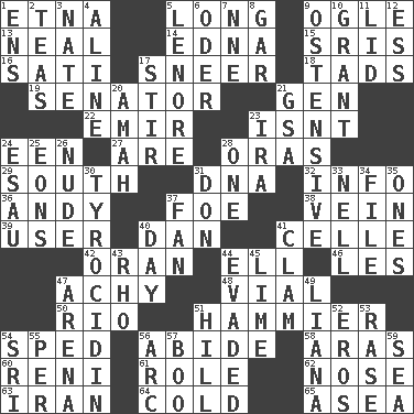 ACROSS 1. Inactive volcano in Sicily 5. Protracted 9. Stare at amorously 13. Actress Patricia 14. Pulitzer Prize-winning author Ferber 15. Indian titles of respect 16. Suttee (variant) 17. Scornful expression 18. Bits 19. Elected representative 21. Commissioned military rank (abbr.) 22. Arab leader 23. Is not 24. Car or cant ending 27. "We ___ not amused" (Victoria) 28. Mouths or openings 29. _ pole 31. Heredity factor (abbr.) 32. Information 36. "60 Minutes" Commentator Rooney 37. Enemy 38. Distinctive style or manner 39. One who uses or employs something 40. Daniel's nick name 41. Cell (Danish) 42. NW Algerian seaport 44. Pipe bend 46. French article 47. Painful 48. Small bottle 50. River (Sp.) 51. More overdramatic by comparison 54. Broke a traffic law 56. Tolerate 58. Ancient river in northeast Turkey 60. Painter Guido (1575-1642) 61. Hero or heavy, e.g. 62. Sense of smell 63. SW Asia republic 64. Lacking warmth 65. Toward the sea DOWN 1. Followers of ems 2. Afternoon social gatherings 3. Nathan's nickname 4. Place in a line 5. Poe poem 6. Baltic tributary 7. Compass dir. 8. Slender fish 9. Clearly or manifestly demonstrative 10. Monetary aid 11. Flaplike covering 12. Curvy letter 17. Use a swizzle stick 20. Wet nurse 21. Girls' org. (abbr.) 23. Retirement account (abbr.) 24. He sold his birthright 25. Immeasurably long periods of time 26. Unadorned 28. Single 30. Polypeptide antibiotic 31. Spanish title 33. 1994 drama film starring Jodie Foster 34. Do some clerical work 35. Washington bills 37. Avid follower 40. 24 hours 41. Burrowing marine mollusk 43. 17th letter of the Greek alphabet 44. Dodged 45. Welles in "The Third Man" 47. Sports stadium 49. Woody, climbing, usually tropical plant 51. Land elevation 52. Greek god of love 53. Raze (variant) 54. _ Lanka 55. For each 56. Curve 57. Oct. 31 cry 59. Ocean