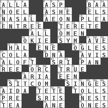 ACROSS 1. Silent film actress Nazimova 5. Viper 8. Sound made by sheep 11. Christmas carol 12. American tennis player Robert 14. Raised railways 15. Relating to the nose 17. Age 18. Entreaty 19. Main course 21. Cylindrical with tapered ends 23. Everything 25. Sign of something about to happen 26. Migrant worker of the '30s 27. Symbol (abbr.) 28. "___ Maria" 31. Actor Linden 33. Compass dir. 35. Stares 37. Root beer relative 38. Heredity factor (abbr.) 40. Deliberation 41. High up in or into the air 43. Indian title of respect (Mr.) 45. Baking dish 46. To riddle 47. The grampus (Milton) 50. Loyal 52. Operatic vocal solo 53. Car or cant ending 54. "Cheers" or "Ellen" 56. Scorches 61. Opera by Verdi 62. False hair 65. For Whom the Bell _____ 66. Before (prefix) 67. Indian titles of respect 68. A home for chicks 69. Beverage made from leaves 70. A saturated hydrocarbon 71. Singles DOWN 1. Queen of England 1702-14 2. Grant temporary use of 3. For fear that 4. Having or resembling wings 5. Auto club (abbr.) 6. Compass dir. 7. Pictures 8. Waist strap 9. Toward shelter 10. White ___ sheet 13. Foe 16. Path through which fluid escapes 18. Fenced enclosure 20. Writer Wiesel 22. San ____ (Riviera town) 24. Grant temporary use of 26. Norwegian king 28. Inventor's middle name 29. Distinctive style or manner 30. Double-curved letter 31. Hollow 32. _ vera 34. Followers of ems 36. Open wide 37. Automobile 39. Johnson of "Laugh-In" 42. Torque (variant) 44. Angers 48. Disturbances 49. Device for capturing images 51. A single undivided whole 52. "One Day ___ Time" 54. The founder of a family 55. The main thing one is thinking about 57. Words to Nanette 58. Small, secluded valley 59. Otherwise 60. Fast planes 61. Fitting 63. Shallow baking pan 64. Compass dir.