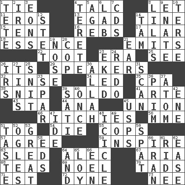 ACROSS 1. Standoff 4. Baby powder 8. Allow 11. Greek god of love 13. Mild oath 14. Prong on a fork 15. Portable shelter 16. Confederate soldiers (slang) 17. Having or resembling wings 18. Core 21. Gives off 22. A blast of a horn 23. Epoch 25. Perceive with the eye 26. ___ a Wonderful Life 29. Orators 32. Wash lightly 34. Directed 35. Numbers guy (abbr.) 38. Sever or remove by pinching or nipping 39. Twentieth part of a lira 41. Johnson of "Laugh-In" 43. R.R. building 44. Santa ___, CA 45. The state of being joined or united 46. Actors Guy, Robert Welles, and Clint 50. Madame (abbr.) 51. Coat; cloak 54. Expire 55. 911 reaches them 57. Match 59. Motivate 63. Downhill vehicle 64. Actor Baldwin 67. Roberta Peters solo 68. Beverages made from leaves 69. Christmas carol 70. Small boys 71. Eastern Standard Time (abbr.) 72. Centimeter-gram-second unit of force 73. Born DOWN 1. Wig 2. Angers 3. Immeasurably long periods of time 4. Cylindrical with tapered ends 5. Personal question 6. Experiment locale 7. Music discs 8. Ms. Damita and namesakes 9. Related on the mother's side 10. Laconic 12. Proofreading order 14. Scottish cap 19. Olfactory organ 20. Police officer (slang) 21. Ewer handle 23. Supplemented with great effort 24. Make new 26. Big collection agency 27. Canisters 28. In a ____ (agitated or irritated) 30. Assad's deity 31. Examine hastily 33. Practice fight 36. Demure 37. Smallest unit of an element 39. Suttee (variant) 40. At one time in the past 42. Compass dir. 45. United States Postal Service (abbr.) 47. Binary compound 48. Ice on the eave 49. Period of immesurable duration 51. Clothes sense 52. Stares at amorously 53. Relatively large 56. Petty quarrel 58. Begley and Asner 60. SW Asia republic 61. Travel on or in a vehicle 62. Comfort 64. Also 65. Myrna of the movies 66. Car or cant ending