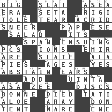 ACROSS 1. Of large size 4. Narrow board 8. Toward the sea 12. Period 13. Stalk of a moss capsule 14. Swiss mountan, "Queen of the Mountains" 15. Lacquered or enameled metalware 17. Rend 18. Sour-tasting 19. Contemptuous expression 21. Infant food 23. Compass dir. 24. First course 26. ___ a Wonderful Life 28. Connect, as a bridge 30. Following as a consequence or result 34. Personal Computers (abbr.) 37. Charged atoms 39. Arab leader 40. "We ___ not amused" (Victoria) 41. Schedule 43. In the manner of 44. Sliced desserts 46. Matures 47. Affirmative reply 48. Refrain by choice 51. Hearing organs 54. Increase 55. National forest in Provo, Utah 58. White ___ sheet 61. Last letter of the English alphabet 63. Plates 65. Maid-servant 67. Passed on 71. Jacques of French films 72. _ vera 73. Like ___ of sunshine 74. Spanish title 75. Portable shelter 76. Female horse 77. Compass dir. DOWN 1. Stakes 2. Metal shackles 3. An organ shaped like a helmet 4. Fast jet (abbr.) 5. Area sheltered from the wind 6. "One Day ___ Time" 7. Canvas cover 8. Curve 9. Father 10. Armor plate that protects the chest 11. Assistant 16. Snakelike fish 18. Tenement units (abbr.) 20. Strike 22. The 18th letter of the Arabic alphabet 25. Raised platform 27. Take to court 29. Pitcher Ryan 30. First name in cosmetics 31. "If ____ say so..." 32. Mediterranean tributary 33. Pate de foie ____ 34. Dad 35. Baby bed with high sides 36. Observes 38. Tired old horse 42. He sold his birthright 45. R.R. building 49. Axlike tool, used for shaping wood 50. Binary compound 52. To free from 53. In a ____ (agitated or irritated) 56. Sadhe (variant) 57. Gambison 58. Blind as ____ 59. Flatfish 60. At once, immediately (arch.) 62. Dutch treat 64. Trig term 66. Fish or hair follower 68. Lyricist Gershwin 69. Ewer handle 70. Color