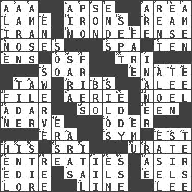 ACROSS 1. Auto club (abbr.) 4. Domed church section 8. Length times width 12. Unable to walk 14. Metal shackles 16. 480, 500 or 516 sheets of paper 17. SW Asia republic 18. Unrelated to defense, as in spending 20. Olfactory organs 22. Health resort 23. Nine, plus one 24. Followers of ems 25. Order of Saint Francis (abbr.) 28. Three (prefix) 30. Fly high 31. Related on the mother's side 35. The 23rd letter of the Hebrew alphabet 37. Teases 40. Toward shelter 41. Do some clerical work 42. Nest on high 44. Christmas carol 45. The sixth month of the Jewish calendar 46. Disposed of to a purchaser 47. Car or cant ending 48. Impudent aggressiveness 50. River in Europe 52. Epoch 54. Symbol (abbr.) 55. Eastern Standard Time (abbr.) 58. Part of HMS, perhaps 61. Indian title of respect (Mr.) 63. A salt of uric acid 65. Pleas 70. SW Saudi Arabia district 71. Singer Brickell 72. Moves on water 73. Snakelike fish 74. Old wives' tales, e.g. 75. Welles in "The Third Man" 76. Area sheltered from the wind DOWN 1. Place in a line 2. Composer Copland 3. Collect or gather 4. The 18th letter of the Arabic alphabet 5. Adept person 6. Male offspring 7. Conclusions 8. "We ___ not amused" (Victoria) 9. Monthly bill 10. Comfort 11. So be it 13. Compass dir. 15. Back-to-school mo. 19. Conductor's collection 21. "Barney Miller" actor Jack 26. "Two Mules for Sister ____" 27. Strips of potato fried in deep fat 29. More lacking in sense or substance 30. Turn aside suddenly 32. _ vera 33. Adolescent 34. Snakelike fish 35. Periodic rise and fall of the sea level 36. Having or resembling wings 38. Sis' sibling 39. Grain storage towers 41. Avid follower 43. Whirlpool 49. Celtic language 51. Australian flightless bird 53. Ancient river in northeast Turkey 55. Artist's stand 56. Vertical member of a panel or frame 57. Laconic 58. The bottom of a shoe or boot 59. _ china 60. Commotion 62. Slanted text style (abbr.) 64. Actress Charlotte 66. To sift 67. One more than two 68. Shade tree 69. Compass dir.