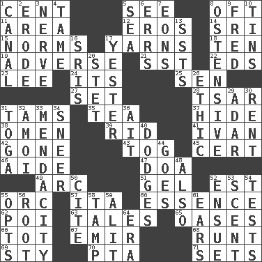 ACROSS 1. Penny 5. Observe 8. Often (poetically) 11. Length times width 12. Greek god of love 14. Indian title of respect (Mr.) 15. Typical models 17. Entertaining tales 18. "___ Little Indians" 19. Contrary to your interests or welfare 21. Fast jet (abbr.) 22. Begley and Asner 23. Area sheltered from the wind 24. ___ a Wonderful Life 25. Elected rep. 27. Arrange properly for use 28. Russian ruler of old 31. Scottish caps 35. Beverage made from leaves 37. Flintstone garb 38. Sign of something about to happen 39. To free from 41. _ the terrible 42. Went 43. Coat; cloak 45. Foregone conclusion 46. Helper 47. ___ good deed 49. Curve 51. Set 52. Eastern Standard Time (abbr.) 55. The grampus (Milton) 57. Call ___ day 60. Core 62. Luau course 63. Lies 65. Fertile tracts in a desert 66. Small child 67. Independent ruler or chieftain 68. The smallest animal of a litter 69. Filthy place 70. Parent Teacher Assoc. 71. Arranges properly for use DOWN 1. Lessep's creation 2. Wear away 3. Impudent aggressiveness 4. Docile 5. Ocean 6. Blunders 7. Immeasurably long periods of time 8. Clearly or manifestly demonstrative 9. Flintstone 10. Metal containers 13. Fast planes 16. Indian titles of respect 17. Last 20. Proofreading order 26. Moral principle 29. The sixth month of the Jewish calendar 30. Monthly bill 31. Ancient Roman robe 32. Mine, in Marseilles 33. Ananias' fault 34. Scornful expression 36. Small island 40. Evades 44. Leaves 48. In addition 50. Quote 52. Follow as a consequence or result 53. Aroma 54. Trials 55. Elects 56. Carrot, for example 58. Pack (down) 59. Came down and settled, as after flight 61. Hearing organs 64. Epoch