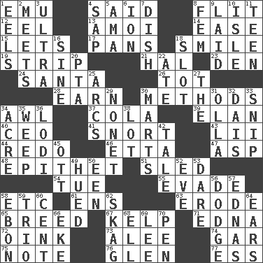 ACROSS 1. Australian flightless bird 4. Alleged 8. Secret move to avoid paying debts 12. Snakelike fish 13. Mine, in Marseilles 14. Comfort 15. Allows 17. Baking dishes 18. Grin 19. Long narrow piece of something 21. Actor Linden 23. Lair 24. Before Barbara or Clara 26. Small child 28. Merit 30. Modes 34. Leather borer 37. Root beer relative 39. Enthusiasm 40. Corporate head (abbr.) 41. Derisive sound 43. Cards in a Roman deck? 44. Do over again 46. Singer James 47. Cleo's killer 48. Curse 51. Downhill vehicle 54. Third day of the wk. 55. Dodge 58. And so on (abbr.) 61. Followers of ems 63. Eat (away) 65. A special lineage 67. Seaweed 71. Pulitzer Prize-winning author Ferber 72. Pig sound 73. Toward shelter 74. Slender fish 75. Short letter 76. Small, secluded valley 77. Double-curved letter DOWN 1. Snakelike fish 2. Confronts 3. Extremist 4. Plant excrement 5. Housemaid (var.) 6. Electrically charged atom 7. Food container 8. Opposite of masc. 9. Put down 10. Capri or Wright 11. Adolescent 16. Trig term 18. Slit 20. Parent Teacher Assoc. 22. Had dinner 25. Curves 27. Definite Article 29. Music written for nine 30. Shops 31. Spanish pot 32. Raised platform 33. Clip 34. 43,560 square feet 35. Shed a tear 36. Farming town in central California 38. Car dealer's back yard 42. Lie 45. Baseball player Mel 49. Took on color 50. Car or cant ending 52. First lady 53. Have the gumption 56. Evade 57. Ferber et al. 58. Inky black, to poets 59. Musical group of three 60. Penny 62. Heroin 64. Hearing organs 66. Make supply last 68. Pipe bend 69. Area sheltered from the wind 70. Fenced enclosure