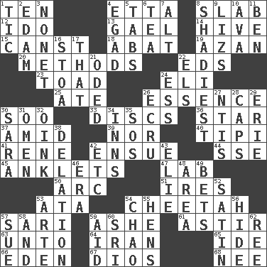 ACROSS 1. "___ Little Indians" 4. Singer James 8. Broad, flat, thick piece 12. Wedding promise 13. Highlander 14. Hub of activity 15. 2nd pers. sing. pres. of can (arch.) 18. Blind as ____ 19. Muslim summons to prayer 20. Modes 22. Begley and Asner 23. Frog relative 24. Connecticut Ivy Leaguer 25. Had dinner 26. Center 30. "Barney Miller" actor Jack 33. Plates 36. Play the lead 37. Among 39. And not 40. Native american tent (variation) 41. French philosopher Descartes 42. Follow as a consequence or result 44. Compass dir. 45. Short socks 47. Experiment locale 50. Curve 51. Angers 53. _ moment's notice (2 wds.) 54. Leopard's kin 57. Indian skirt 59. American tennis player Robert 61. Moving about 63. To (old English) 64. SW Asia republic 65. Binary compound 66. Paradise 67. "Vaya con ____" 68. Born DOWN 1. Nervous spasm 2. Dutch treat 3. Music written for nine 4. Mild oath 5. Bar bills 6. Beverage made from leaves 7. The first octave above the treble staff 8. Most dubious of character or honesty 9. Belonging to Elizabeth 10. Actress Gardner 11. Benjamin's nick name 16. Portico 17. Not this but _ 21. Wrote a lyric poem 22. Raised railways 24. Double-curved letter 26. Shade of tan 27. Nuclear Threat Initiatives 28. Balmoral and tarboosh 29. 4th largest of the Great Lakes 30. "Two Mules for Sister ____" 31. Presage 32. Pig sound 34. Lodging establishments 35. Mayday 38. Conveyance 42. And so on (abbr.) 43. Writer Wiesel 46. Epoch 48. Type of rug 49. Wagers 52. Smooth fabric 53. Johnson of "Laugh-In" 54. US Secretary of Labor Elaine L. _ 55. Coop moms 56. Flintstone garb 57. Institute legal proceedings 58. Added to 59. Assist 60. Indian title of respect (Mr.) 62. Portuguese money of account (variant)