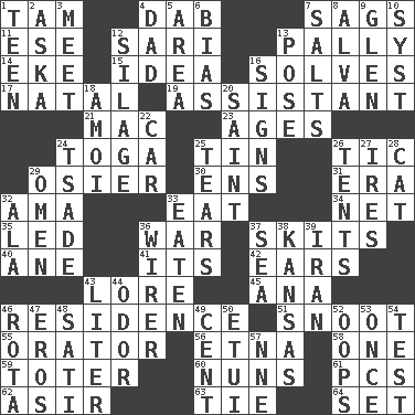 ACROSS 1. Scottish cap 4. Small moist lump or mass 7. Droops 11. Compass dir. 12. Indian skirt 13. Friendly 14. Supplement with great effort 15. The content of cognition 16. Finds the solution 17. Relating to or accompanying birth 19. Helper 21. Big _ 23. Matures 24. Ancient Roman robe 25. Shallow baking pan 26. Nervous spasm 29. Flexible twig of a willow tree 30. Followers of ems 31. Epoch 32. Nursemaid (var.) 33. Ingest 34. Fish or hair follower 35. Directed 36. Armed conflict 37. Burlesque acts 40. A saturated hydrocarbon 41. ___ a Wonderful Life 42. Hearing organs 43. Old wives' tales, e.g. 45. Santa ___, CA 46. Home 51. Snout, nose 55. Speaker 56. Inactive volcano in Sicily 58. Single 59. Carrier 60. Religious women 61. Personal Computers (abbr.) 62. SW Saudi Arabia district 63. Neckwear 64. Put into a specified state DOWN 1. Adolescent 2. "____ silly question..." 3. Confront 4. Male parent 5. Length times width 6. Prejudice 7. Table seasonings 8. Inventor's middle name 9. Small, secluded valley 10. System (abbr.) 12. Fodder prepared in a silo 13. Introduce or present, as a question 16. Attaches a signature 18. Mine, in Marseilles 20. Virtuous person 22. Auto 24. Sadhe (variant) 25. Lacerates 26. Portable shelters 27. Angers 28. Domesticated feline 29. Sign of things to come 32. Insect wing 33. Ingested 36. One who wires 37. Ocean 38. Sunflower state 39. SW Asia republic 43. 61 cubic inches 44. Scent 46. Roll call or roster of names 47. Greek god of love 48. Suttee (variant) 49. Penny 50. Needle holder 52. I made a mistake 53. Single time 54. Trial 57. Compass dir.