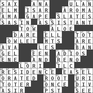 ACROSS 1. Saxophone 4. Santa ___, CA 7. ____ Bator, Mongolia 11. Shade tree 12. Austrian river, tributary to the Danube 13. Odor 14. Wet nurse (var.) 15. Stare wonderingly 16. Chalkboards 17. Indian antelope 19. Aide 21. Pull behind 23. Medicinal plant 24. Have the gumption 25. Pipe bend 26. Small child 29. A small or young owl 30. Mountains (abbr.) 31. "We ___ not amused" (Victoria) 32. Actress Gardner 33. French article 34. Bar 35. Set 36. Car or cant ending 37. Goodbye (Sp.) 40. Compass dir. 41. Plus 42. Western Nevada city 43. Australian parrot (variant) 45. Affectionate concern, for short 46. Dwelling 51. Artist's stand 55. Declaimed 56. Carrot, for example 58. RI univ. 59. Carrier 60. At one time in the past 61. HTML Container Element 62. SW Saudi Arabia district 63. Pacific Standard Time (abbr.) 64. Observe DOWN 1. Oceans 2. _ mater 3. Dec. holiday 4. White ___ sheet 5. California wine valley 6. Ancient Greek god of war 7. A salt of uric acid 8. Globular water bottle used in Asia 9. So be it 10. Political cartoonist Thomas 12. Snub 13. In addition 16. Beverly of Met fame 18. Slanted text style (abbr.) 20. Table seasonings 22. Dripping 24. A sleeping potion; an opiate (poet.) 25. Make improvements or corrections to 26. Off limits 27. Mouths or openings 28. "___ Little Indians" 29. Baking chamber 32. Mature 33. Soviet premier 1918-24 36. Having ears or earlike features 37. Nonscientific branch of learning 38. Keyboard key 39. South American Indian 43. 61 cubic inches 44. River in Europe 46. Round or rotation of duties 47. Greek god of love 48. Suttee (variant) 49. Riding implement 50. Immeasurably long periods of time 52. Soap bubbles 53. One of the Great Lakes 54. Moving, as bait 57. Sep. follower