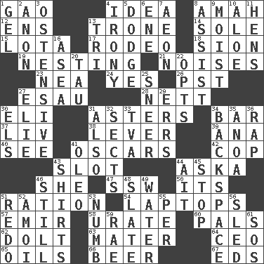 ACROSS 1. E Mali city 4. The main thing one is thinking about 8. Housemaid 12. Followers of ems 13. Marketplace scale 14. Not divided or shared with others 15. Globular water bottle used in Asia 17. Cowboy competition 18. The Jewish people; Israel 19. Nestling 21. Annoying sounds 23. Teachers' org. 24. It is so 26. Pacific Standard Time (abbr.) 27. He sold his birthright 28. Remaining after all deductions 30. Connecticut Ivy Leaguer 31. Michaelmas daisies 34. Drinking establishment 37. 54 in ancient Rome 38. Crowbar 39. Santa ___, CA 40. Observe 41. Motion picture awards 42. Police officer (slang) 43. Narrow opening 44. "____ silly question..." 46. A female animal or person 47. Compass dir. 50. ___ a Wonderful Life 51. Food allowance for one day 54. Portable computers 57. Arab leader 58. A salt of uric acid 60. Friends 62. Stupid person 63. Mother 64. Corporate head (abbr.) 65. Petroleums 66. Fermented drink made from hops 67. Begley and Asner DOWN 1. Set 2. At once, immediately (arch.) 3. Clearly or manifestly demonstrative 4. Literary sarcasm 5. Evade 6. Compass dir. 7. Period of immesurable duration 8. Help 9. Damp 10. _ vera 11. Coop moms 13. Three (prefix) 16. Toward the sea 20. The 19th letter of the Greek alphabet 22. Chooses 25. Contemptuous expression 27. Writer Wiesel 29. Blunders 30. Raised railways 31. In addition 32. Religious groups 33. Federal power corp. 34. Keyboard key 35. Small Philippine buffalo 36. Strike 41. Butter sub 43. Chest coverings 44. Small island 45. Discontinue 46. Not moving 48. Schedule 49. Wetness 51. Redecorate 52. Mine, in Marseilles 53. Unfeeling 55. For each 56. Downhill vehicle 59. Actress Charlotte 61. Distress signal