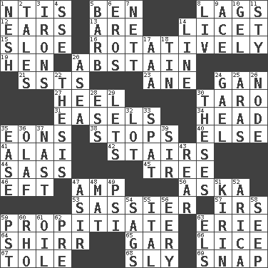 ACROSS 1. Nuclear Threat Initiatives 5. Benjamin's nick name 8. Falls behind 12. Hearing organs 13. "We ___ not amused" (Victoria) 14. It is permitted: Lat. 15. A type of plum 16. Rotating or pertaining to rotation 19. Layer 20. Refrain by choice 21. Fast planes 23. One (Scot) 24. Separate the seeds from cotton 27. Person who is morally reprehensible 30. Edible starchy tuberous root 31. Artist's stands 34. Froth on beer 35. Immeasurably long periods of time 38. Ceases 40. Otherwise 41. Mountain range southwest of Kyrgyzstan 42. Flight of steps 44. Backtalk 45. Family _ (genealogy) 46. Bank Draft (abbr.) 47. Electrical Unit 50. "____ silly question..." 53. More impudent 57. Big collection agency 59. Conciliate 63. One of the Great Lakes 64. Bake eggs in their shells 65. Slender fish 66. Louse (plural) 67. Lacquered or enameled metalware 68. Mischievous 69. Fastener DOWN 1. Soft 2. Lies 3. Removes the wrinkles 4. Compass dir. 5. Sharp remark 6. Greek god of love 7. Remaining after all deductions 8. 54 in ancient Rome 9. Adept person 10. Set 11. Filthy place 14. Actor's bit 17. Auto club (abbr.) 18. Metal container 20. At sea 22. College paper 24. Highlander 25. Ancient river in northeast Turkey 26. Connecting point 28. Double-curved letter 29. Allows 30. College papers 32. Car dealer's back yard 33. Petty quarrel 35. Comfort 36. Norwegian king 37. Political cartoonist Thomas 39. Title for a knight 43. Stern 47. SW Saudi Arabia district 48. Floor covering 49. Air pressure measure (abbr.) 51. Japanese brewing company 52. N. Chile seaport 54. Droops 55. Slanted text style (abbr.) 56. Suggestive of the supernatural 58. Ooze 59. Pacific Standard Time (abbr.) 60. 17th letter of the Greek alphabet 61. Petroleum 62. Before (prefix) 63. Raised railways