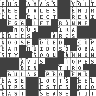ACROSS 1. Purulenc 4. Collect or gather 9. Electrical Unit 13. To riddle 14. Falsehoods 15. Independent ruler or chieftain 16. Biblical high priest 17. Voters do this 18. Painter Guido (1575-1642) 19. Oval reproductive body of a fowl 21. Allow 22. Maid-servant 24. Good sense 26. Lyricist Gershwin 27. Off-Broadway awards 29. Curves 30. Trap for birds or small mammals 31. Passed on 33. Police officer (slang) 36. Hearing organ 37. Boisterous (Brazilian Portuguese) 40. Chief or king in Benin or Nigeria 41. Filthy place 42. Within a short period 43. ID or VA city 45. Deliberation 47. Drinks excessively 48. Storage container 49. Through, poetically 50. POW camp 52. Adept person 54. Conclusion 56. Relaxation 57. Plunders 59. Snakelike fish 61. Pinches, bites 62. _____ Park, CO 63. Non-commissioned officer (abbr.) 64. 90 degrees 65. Gospel singer Marvin 66. Teat (slang) DOWN 1. Before (prefix) 2. Ubangi River tributary 3. Signiory (variant) 4. Had dinner 5. Shopping centers 6. Toward shelter 7. Religious group 8. Fast jet (abbr.) 9. Actresses Bloom and Felton 10. Sign of things to come 11. Actor's bit 12. Three (prefix) 20. Moves 22. Avian creatures 23. The grampus (Milton) 25. One who uses or employs something 27. Washington bills 28. Water vessel 29. Age 31. "Vaya con ____" 32. Wedding promise 33. Part 34. Mitch Miller's instrument 35. Zero-star reviews 38. Exploiting 39. Pledge 44. Greater amount 45. Most capable 46. By way of 49. Lugs 50. Greek goddess of the earth (variant) 51. United States Postal Service (abbr.) 52. Airs 53. Roll call or roster of names 55. Tenth: prefix 56. Compass dir. 57. French article 58. Compass dir. 60. Car dealer's back yard