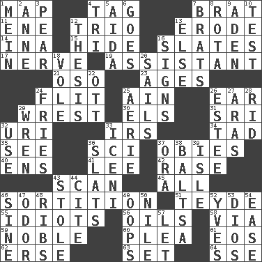 ACROSS 1. Atlas unit 4. Label 7. Naughty child 11. Compass dir. 12. Musical group of three 13. Wear away 14. _ tizzy (2 wds.) 15. Flintstone garb 16. Chalkboards 17. Boldness 19. Aide 21. Bear (Spanish) 23. Matures 24. Sudden quick movement 25. The 18th letter of the Arabic alphabet 26. Ewer handle 29. Obtain by seizing forcibly or violently 30. Raised railways 31. Indian title of respect (Mr.) 32. RI univ. 33. Big collection agency 34. Small boy 35. Perceive with the eye 36. _-fi 37. Off-Broadway awards 40. Followers of ems 41. Area sheltered from the wind 42. Raze (variant) 43. Glance over 45. Everything 46. Decision 51. Miss Universe 1986, Barbara Palacios _ 55. Foolish or stupid persons 56. Petroleums 58. By way of 59. Impressive in appearance 60. Entreaty 61. Greek goddess of the dawn 62. Celtic language 63. Arrange properly for use 64. Compass dir. DOWN 1. Count _ (2 wds.) 2. Queen of England 1702-14 3. Lightbulb-shaped fruit 4. Three (prefix) 5. Opera by Verdi 6. Travels 7. Naughty children 8. Round or rotation of duties 9. An important port of Yemen 10. Trial 12. College paper 13. Otherwise 16. Omens 18. Short-tailed, large-bodied rat 20. Travel by water 22. Baseball player Mel 24. Strips of potato fried in deep fat 25. Nest on high 26. First name in cosmetics 27. Caspian sea tributary 28. To free from 29. Songbird 32. Purpose 33. Ancient Celtic tribe of eastern Britain 36. Narrow boards 37. Mouth or opening 38. Greek mezzo-soprano Agnes 39. Capri or Wright 43. Fur scarf 44. Quote 46. Trig term 47. Scent 48. Chest bones 49. I made a mistake 50. Mediterranean tributary 52. Jacques Cousteau's middle name 53. "Vaya con ____" 54. Relaxation 57. Allow