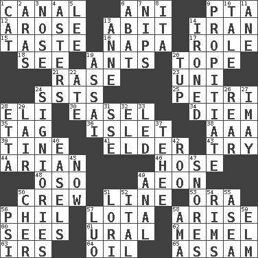 ACROSS 1. Lessep's creation 6. Black tropical American cuckoo 9. Parent Teacher Assoc. 12. Came up 13. "This won't hurt ____!" 14. SW Asia republic 15. Clothes sense 16. California wine valley 17. Hero or heavy, e.g. 18. Perceive with the eye 19. Pismires 20. Drink excessively 21. To erase 23. Corn or form start 24. Fast planes 25. _ dish (used to culture cells) 28. Biblical high priest 30. Artist's stand 34. South Vietnam president (1954) 35. Label 36. Small island 38. Auto club (abbr.) 39. Prong on a fork 41. A person who is older than you are 43. Attempt 44. Believer in; advocate of (suffix) 46. Stockings 48. Bear (Spanish) 49. A really long time 50. Group working together 51. Actor's bit 53. Mouth or opening 56. Silvers or Donahue 57. Globular water bottle used in Asia 58. Ascend 60. Perceives with the eye 61. Mountain range 62. Klaipeda city 63. Big collection agency 64. Lubricate 65. Indian state DOWN 1. Feline 2. Caspian sea tributary 3. Olfactory organ 4. Michaelmas daisies 5. Area sheltered from the wind 6. Blind as ____ 7. Pinches, bites 8. Call ___ day 9. Appease 10. Falsehood 11. One (Scot) 13. Queen of England 1702-14 14. Pressed 19. Slender Brazilian palm 20. Uncastrated adult male sheep 22. Had dinner 24. Seigniories (variant) 26. Located in or toward the back 27. "If ____ say so..." 28. Singer James 29. Den 31. Compass dir. 32. Pipe bend 33. Directed 37. Giggle 40. Artist's stands 42. Friend of Pooh 45. At this time 47. Sounds asleep 49. Of or related to the anus 50. "Mermaids" star 51. Australian parrot (variant) 52. Slanted text style (abbr.) 54. Basketball hoops 55. Toward the sea 56. 23rd letter of the Greek alphabet 57. Nilotic language 58. Nursemaid (var.) 59. Shade tree