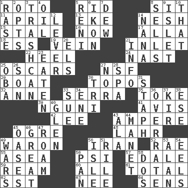 ACROSS 1. Printing process, for short 5. To free from 8. Be seated 11. Showery time 13. Supplement with great effort 14. Soft 15. Lacking originality or spontaneity 16. At this time 17. Silent film actress Nazimova 18. Curvy letter 19. Distinctive style or manner 21. An arm off of a larger body of water 22. Person who is morally reprehensible 24. Political cartoonist Thomas 25. Motion picture awards 27. Overdraft (abbr.) 29. Water vessel 30. Traditional theme or motif 32. Queen of England 1702-14 33. Spanish missionary in California 35. Casino tip 39. Group of southern Bantu languages 41. Advice 42. Area sheltered from the wind 43. Electrical Unit 45. Legendary monster 48. Cowardly lion portrayer 49. Make _____ (do battle with) 50. SW Asia republic 52. Actress Charlotte 55. Toward the sea 56. Air pressure measure (abbr.) 57. Peak District village in England 59. 480, 500 or 516 sheets of paper 60. Everything 61. Add up to 62. Fast jet (abbr.) 63. Born 64. Elected reps. DOWN 1. To erase 2. Elects 3. File 13 4. Petroleum 5. Painter Guido (1575-1642) 6. Picture 7. Morning condensation 8. Makes a sale 9. Small island 10. Not this but _ 12. Crowbar 14. Grandmother 20. Raised railways 21. A message received and understood 23. Ingested 25. Chief or king in Benin or Nigeria 26. Male offspring 27. Not either 28. Health resort 30. Three (prefix) 31. Staphylococcus 33. Institute legal proceedings 34. Compass dir. 36. Make much ado about nothing 37. Apertif with cassis 38. Compass dir. 40. Small, secluded valley 43. Wing 44. French painter Edouard 45. Fertile tracts in a desert 46. Relatively large 47. Wander aimlessly 49. Armed conflicts 50. Small island 51. Cause heat under the collar 53. Actor Alda or Thicke 54. Snakelike fish 56. Baking dish 58. Two (Sp.)