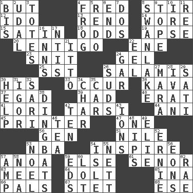 ACROSS 1. On the contrary 4. Flintstone 8. Use a spoon 12. Wedding promise 13. Former U.S. Attorney General Janet 14. Had on 15. Smooth fabric 18. Likelihood 19. Domed church section 20. Small, flat, pigmented spot on the skin 22. Compass dir. 23. In a ____ (agitated or irritated) 24. Set 25. Fast jet (abbr.) 26. Deli grouping 30. Part of HMS, perhaps 33. Come to pass 36. Polynesian shrub of the pepper family 37. Mild oath 39. Possessed 40. Part of Q.E.F. 41. Australian parrot (variant) 42. Tarsus (plural) 44. Cuckoo 45. Hard copy producer 47. Single 50. Commissioned military rank (abbr.) 51. The longest river in the world 53. Basketball assoc. 54. Motivate 57. Small Philippine buffalo 59. Otherwise 61. Sir (Sp.) 63. Rendezvous 64. Dunce 65. _ tizzy (2 wds.) 66. Friends 67. Proofreading order 68. Compass dir. DOWN 1. Twice 2. Hereditary estate 3. Hauls 4. Tree-dwelling hopper 5. Redecorate 6. Conclusion 7. Two (Sp.) 8. Tchaikovsky ballet 9. Drink excessively 10. Big collection agency 11. To riddle 16. Lodging establishments 17. Nuclear Threat Initiatives 21. "Tell ____ the Marines!" 22. Snakelike fish 24. Slender fish 26. Beer foam 27. Hindu Mythology: god of death 28. "Terrible" tsar 29. Suttee (variant) 30. Aid 31. Composer Stravinsky 32. Indian skirt 34. Burn to charcoal 35. Automobile 38. Empty-headed or silly people 42. "___ Little Indians" 43. Charged particles 46. Beverage made from leaves 48. Cuts off 49. Writer Wiesel 52. Bert's buddy 53. Christmas carol 54. Small island 55. Remaining after all deductions 56. Immeasurably long periods of time 57. Electrical Unit 58. Teachers' org. 59. Begley and Asner 60. Car dealer's back yard 62. Actress Charlotte