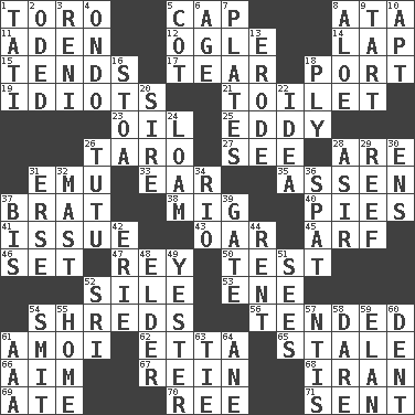 ACROSS 1. "Corrida" creature 5. Head covering 8. "One Day ___ Time" 11. An important port of Yemen 12. Stare at amorously 14. Pet locale 15. Looks after 17. Pull apart 18. Left side of a ship or aircraft 19. Foolish or stupid persons 21. Bathroom plumbing fixture 23. Lubricate 25. Whirlpool 26. Edible starchy tuberous root 27. Perceive with the eye 28. "We ___ not amused" (Victoria) 31. Australian flightless bird 33. Ewer handle 35. NE Netherlands city 37. Naughty child 38. Russian fighter aircraft 40. Sliced desserts 41. Come out of 43. Rowing implement 45. Sandy's bark 46. Arrange properly for use 47. Marina Del _, California 50. Trial 52. Filth; sediment 53. Compass dir. 54. Tears up 56. Watched over 61. Mine, in Marseilles 62. Singer James 65. Lacking originality or spontaneity 66. Direct toward a target or goal 67. It's straight from the horse's mouth 68. SW Asia republic 69. Had dinner 70. To riddle 71. Emitted DOWN 1. Jacques of French films 2. Wrote a lyric poem 3. Painter Guido (1575-1642) 4. Southwest Nigerian state 5. Small bed 6. Grow older 7. Food holders 8. _ vera 9. Small pie 10. Fitting 13. Eat (away) 16. Portico 18. Travel a route regularly 20. The founder of a family 22. The content of cognition 24. Rich soil 26. Ballerina skirt 28. SW Saudi Arabia district 29. Coral collection 30. Followers of ems 31. Celtic language 32. Vertical spar for supporting sails 34. _ de Janeiro 36. Petty quarrel 37. Again 39. Yard entry 42. 4th largest of the Great Lakes 44. Monthly bill 48. A person who is older than you are 49. Last past 51. Perceives with the eye 52. Indian title of respect (Mr.) 54. Stricken, poetically 55. Residence 57. Nuclear Threat Initiatives 58. Have the gumption 59. Style 60. Scratch 61. American Automobile Association (abbr.) 63. Neckwear 64. A saturated hydrocarbon
