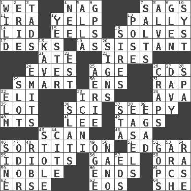 ACROSS 1. Soggy 4. Tired old horse 7. Sinks 11. Lyricist Gershwin 12. Sharp bark 13. Chummy 14. Hat (slang) 15. Snakelike fish 16. Finds the solution 17. Writing tables 19. Aide 21. Had dinner 23. Angers 24. Nights before holidays 25. Mature 26. Music discs 29. Don Adams' spy role 30. Followers of ems 31. Hit sharply and swiftly 32. Connecticut Ivy Leaguer 33. Big collection agency 34. Actress Gardner 35. Car dealer's back yard 36. _-fi 37. Oozy 40. Mountains (abbr.) 41. Area sheltered from the wind 42. Labels 43. Examine minutely or intensely 45. White ___ sheet 46. Casting lots 51. _ Allan Poe 55. Foolish or stupid persons 56. Highlander 58. Mouth or opening 59. Having high moral qualities 60. Conclusions 61. Personal Computers (abbr.) 62. Celtic language 63. Greek goddess of the dawn 64. A female animal or person DOWN 1. Uncontrolled 2. One of the Great Lakes 3. Small boys 4. Born 5. Silent film actress Nazimova 6. Global Positioning Systems (abbr.) 7. Table seasonings 8. Inventor's middle name 9. Small, secluded valley 10. System (abbr.) 12. Last 13. Airs 16. Titles for men of rank and authority 18. Polynesian shrub of the pepper family 20. Omens 22. Eastern Standard Time (abbr.) 24. Gives off 25. Nest on high 26. Dice game 27. _ Jones' Locker 28. Health resort 29. Narrow, elongated depression 32. Shade tree 33. Ancient Celtic tribe of eastern Britain 36. Narrow boards 37. R.R. building 38. Artist's stands 39. Mild oath 43. Fur scarf 44. Quote 46. Trig term 47. Scent 48. Teases 49. Double curve, resembling the letter S 50. Billionth: prefix 52. Republicans 53. Bowlike part 54. To erase 57. Begley and Asner