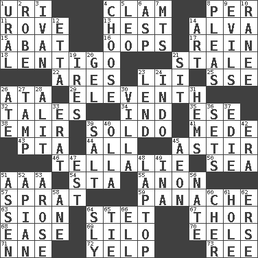 ACROSS 1. RI univ. 4. Dollar (slang) 8. For each 11. Be footloose 13. Behest 14. Inventor's middle name 15. Blind as ____ 16. I made a mistake 17. It's straight from the horse's mouth 18. Small, flat, pigmented spot on the skin 21. Showing deterioration from age 22. Ancient Greek god of war 23. Cards in a Roman deck? 25. Compass dir. 26. _ moment's notice (2 wds.) 29. Veterans Day date 32. Stories 34. Indiana (abbr.) 35. Compass dir. 38. Arab leader 39. Twentieth part of a lira 41. Ancient Persian 43. Parent Teacher Association (abbr.) 44. Everything 45. Moving or stirring 46. Copy Pinocchio 50. Ocean 51. Auto club (abbr.) 54. R.R. building 55. Soon (poet.) 57. Small fatty European fish 59. Flamboyance 63. The Jewish people; Israel 64. Proofreading order 67. Son of Odin 68. Relaxation 69. _ and Stitch 70. Snakelike fish 71. Compass dir. 72. Sharp bark 73. To separate or throw off DOWN 1. Mountain range 2. Loose flowing garment 3. "Terrible" tsar 4. Opt 5. Lion 6. Cleo's killer 7. Mountains (abbr.) 8. Entreaties 9. Vices 10. Indian princess (variant) 12. Singer James 14. Nonscientific branch of learning 19. Angers 20. Set 21. Be seated 23. Grant temporary use of 24. Southeast Asian peninsula 26. Had dinner 27. Pack (down) 28. Set down 30. Country residence 31. Equivocates 33. Part of Q.E.F. 36. Puts into a specified state 37. Singer Brickell 39. Table seasoning 40. Water jar 42. Period 45. A really long time 47. Eastern Standard Time (abbr.) 48. Portable computer 49. _ tizzy (2 wds.) 51. NE Netherlands city 52. Bee-related 53. Came up 56. Nathan's nickname 58. One (Scot) 60. "Mermaids" star 61. Hollow 62. Celtic language 64. Wily 65. Make a knot 66. Pipe bend
