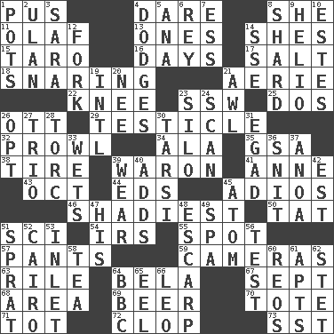 ACROSS 1. Festering 4. Have the gumption 8. A female animal or person 11. Norwegian king 13. Singles 14. "______ My Girl" (Turtles hit) 15. Edible starchy tuberous root 16. 24-hour periods 17. Table seasoning 18. Catching in a trap 21. Nest on high 22. Leg joint 23. Compass dir. 25. Two (Sp.) 26. Baseball player Mel 29. One of the two male reproductive glands 32. Move like a hungry wolf 34. Chicken ___ king 35. Girls' org. (abbr.) 38. Become fatigued 39. Make _____ (do battle with) 41. Singer Murray 43. Sep. follower 44. Begley and Asner 45. Goodbye (Sp.) 46. Most dubious of character or honesty 50. Make lace 51. _-fi 54. Big collection agency 55. Specific locale 57. Leg coverings 59. Devices for capturing images 63. Cause heat under the collar 64. Actor Lugosi 67. Back-to-school mo. 68. Length times width 69. Fermented drink made from hops 70. Lug 71. Small child 72. Hoof sound 73. Fast jet (abbr.) DOWN 1. Cooking vessels 2. Uhlan (variant) 3. "Two Mules for Sister ____" 4. Evades 5. Santa ___, CA 6. Marina Del _, California 7. Double-curved letter 8. Pottery fragment 9. Sun: prefix 10. _____ Park, CO 12. Tined utensil 14. Compass dir. 19. International (abbr.) 20. Born 21. Leather borer 23. Grain storage tower 24. Skim 26. Elect 27. Musical group of three 28. Torque (variant) 30. Tarsus (plural) 31. Mild oath 33. Soaks 36. In a ____ (agitated or irritated) 37. Small Philippine buffalo 39. Erode 40. Does sums 42. Eastern Standard Time (abbr.) 45. Smallest unit of an element 47. Part of HMS, perhaps 48. Fortification 49. Health resort 51. Small fatty European fish 52. Capital of Egypt 53. An arm off of a larger body of water 56. Trial 58. Afternoon social gathering 60. Vintage cars 61. Tenement units (abbr.) 62. Proofreading order 64. English channel? 65. Snakelike fish 66. Lion