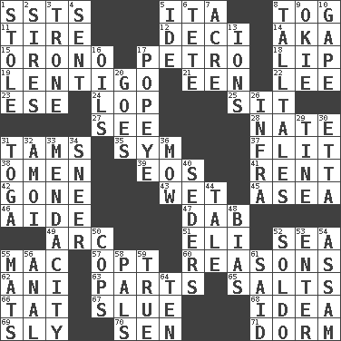 ACROSS 1. Fast planes 5. Call ___ day 8. Coat; cloak 11. Hoop that covers a wheel 12. Tenth: prefix 14. Alias (abbr.) 15. U. of Maine site 17. Stone: prefix 18. Mouth edge 19. Small, flat, pigmented spot on the skin 21. Car or cant ending 22. Area sheltered from the wind 23. Compass dir. 24. Chop off 25. Be seated 27. Observe 28. Nathan's nickname 31. Scottish caps 35. Symbol (abbr.) 37. Sudden quick movement 38. Sign of something about to happen 39. Greek goddess of the dawn 41. Monthly bill 42. Went 43. Soggy 45. Toward the sea 46. Helper 47. Pat or tap gently 49. Curve 51. Biblical high priest 52. Ocean 55. Big _ 57. Choose 60. Thinks logically 62. Black tropical American cuckoo 63. Pieces 65. Table seasonings 66. Make lace 67. Change direction abruptly 68. It may be bright or harebrained 69. Cunning 70. Elected rep. 71. Dormintory (informal) DOWN 1. Fur scarf 2. Begets 3. Marketplace scale 4. Posted 5. Binary compound 6. Wig 7. 1/640 square mile 8. Baron Munchausen's specialties 9. Migrant worker of the '30s 10. Stare wonderingly 13. Charged atoms 16. Lubricates 17. Wimpy's pal 20. Moves 26. Kind of red light 29. Prong on a fork 30. Singer James 31. Ancient Roman robe 32. Mine, in Marseilles 33. Ananias' fault 34. Scornful expression 36. Cut the grass 40. Spring feasts 44. Story 48. Prejudice 50. 911 reaches them 52. Twentieth part of a lira 53. Keyboard key 54. Indian state 55. Floor protectors 56. Of or related to the anus 58. Friends 59. Loyal 61. Alleged 64. Nine, plus one