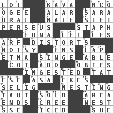 ACROSS 1. Car dealer's back yard 4. Polynesian shrub of the pepper family 8. Non-commissioned officer (abbr.) 11. Double curve, resembling the letter S 13. Having or resembling wings 14. "Two Mules for Sister ____" 15. Mountain range 16. Nathan's nickname 17. Proofreading order 18. Son of Zeus who helped slay Medusa 21. Staphylococcus 22. Pulitzer Prize-winning author Ferber 23. Luau accessory 25. French article 26. Sandy's bark 29. What propaganda does 32. Annoyingly loud 34. Followers of ems 35. Pet locale 38. Inactive volcano in Sicily 39. Scorch 41. Competent 43. Small bed 44. Find the sum of 45. Off-Broadway awards 46. Consumed 50. Make lace 51. Compass dir. 54. White ___ sheet 55. Makes supply last 57. Major League Baseball Commissioner Bud 59. Nestling 63. Strained 64. Exchanged or delivered for money 67. Type of rug 68. Conclusions 69. Algonquian 70. A home for chicks 71. Compass dir. 72. On the rocks 73. A female animal or person DOWN 1. Central Nebraska county 2. Legendary monster 3. Pull into pieces 4. Sunflower state 5. In the manner of 6. Large container 7. "We ___ not amused" (Victoria) 8. Relating to or accompanying birth 9. Streamer paper 10. Curses 12. Otherwise 14. Fast jet (abbr.) 19. Whirlpool 20. University (slang) 21. Be seated 23. Protracted 24. Celtic language 26. A saturated hydrocarbon 27. College mil. group 28. Fine (Spanish) 30. Is inclined (to) 31. Thick slice 33. Suttee (variant) 36. "This won't hurt ____!" 37. Entreaty 39. Settles 40. The main thing one is thinking about 42. Eastern Standard Time (abbr.) 45. Lyric poems 47. Tired old horse 48. Looked after 49. Supplement with great effort 51. _____ Park, CO 52. Actors Connery and Penn 53. Evade 56. Comedian Laurel of Laurel & Hardy 58. It is 60. Angers 61. Soft 62. Yard entry 64. _-fi 65. The grampus (Milton) 66. Area sheltered from the wind