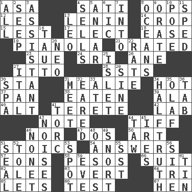 ACROSS 1. White ___ sheet 4. Suttee (variant) 8. I made a mistake 12. French article 13. Soviet premier 1918-24 14. Riding implement 15. For fear that 17. Voters do this 18. Relaxation 19. Player piano 21. Spoke pompously 23. Take to court 24. _ Lanka 26. A saturated hydrocarbon 27. "Tell ____ the Marines!" 28. Fast planes 30. R.R. building 31. Ear of corn 34. Being at a high temperature 37. Baking dish 38. Consumed 39. Insect wing 40. The first octave above the treble staff 41. Cylindrical with tapered ends 42. Experiment locale 43. Musical sound 44. Small quarrel 46. Or not 47. Two (Sp.) 50. Tate display 51. Unemotional ones 54. Statements in reply to questions 57. Immeasurably long periods of time 58. Mexican monetary units 60. Set or collection 62. Toward shelter 63. Unconcealed 64. Three (prefix) 65. Allows 66. Trial 67. Layer DOWN 1. Everything 2. Ooze 3. Helper 4. Exchanges for money 5. Approach 6. Nervous spasm 7. To the inside or interior of 8. Seas 9. Speak pompously 10. Airs 11. Moved rapidly 13. Lion 16. Strained 20. Modern: prefix 22. Assign a rank or rating to 25. Small island 27. Slanted text style (abbr.) 29. Trig term 30. Health resort 31. Confront 32. Having ears or earlike features 33. Had dinner 34. Not exactly gospel 35. Norwegian king 36. Keyboard key 41. Torque (variant) 43. Annoying sounds 44. The 23rd letter of the Hebrew alphabet 45. Angers 46. Music written for nine 48. Fertile tracts in a desert 49. Derisive sound 51. Lick closed 52. Lacquered or enameled metalware 53. Blemish 55. Fast jet (abbr.) 56. The founder of a family 59. Night before a holiday 61. Shallow baking pan