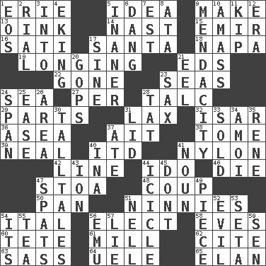 ACROSS 1. One of the Great Lakes 5. The content of cognition 9. Cause to be 13. Pig sound 14. Political cartoonist Thomas 15. Independent ruler or chieftain 16. Suttee (variant) 17. Before Barbara or Clara 18. California wine valley 19. Yearning 21. Begley and Asner 22. Went 23. Oceans 24. Ocean 27. For each 28. Baby powder 29. Actors' quests 31. Not strict 32. Austrian river, tributary to the Danube 36. Toward the sea 37. Small island 38. Heavy book 39. Be tempered by heat 40. It would 41. Thermoplastic polyamide 42. Actor's bit 44. Wedding promise 46. Expire 47. Portico 48. Clever action or accomplishment 50. Baking dish 51. Simpletons 54. Slanted text style (abbr.) 56. Choose 58. Nights before holidays 60. Wig 61. Place where flour is made 62. Quote 63. Backtalk 64. Ubangi River tributary 65. Flair DOWN 1. Greek goddess of the dawn 2. Monetary unit of Yemen 3. To the inside or interior of 4. Supplementing with great effort 5. More lacking in sense or substance 6. Mild oath, euphamism for damn 7. Eastern Standard Time (abbr.) 8. "One Day ___ Time" 9. Ananias' fault 10. Collect or gather 11. Sleep 12. Epoch 17. Trig term 20. Republicans 21. Snakelike fish 23. Saxophone 24. Connect, as a bridge 25. Relaxation 26. Type of rug 28. Make lace 30. Baron Munchausen's specialties 31. Flaplike covering 33. Disposed of to a purchaser 34. Mine, in Marseilles 35. French philosopher Descartes 37. Had dinner 40. _ tizzy (2 wds.) 41. Part of speech 43. Electrically charged atom 44. Ice on the eave 45. Do not 47. Arguments over trivial matters 49. Component 51. 1994 drama film starring Jodie Foster 52. Tending to cause great harm 53. Bristle 54. ___ a Wonderful Life 55. Afternoon social gathering 56. Australian flightless bird 57. Whopper 59. Elected rep.