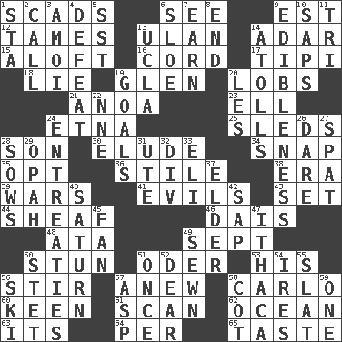 ACROSS 1. Tons 6. Observe 9. Eastern Standard Time (abbr.) 12. Softens 13. ____ Bator, Mongolia 14. The sixth month of the Jewish calendar 15. High up in or into the air 16. Drawstring 17. Native american tent (variation) 18. Untruth 19. Small, secluded valley 20. Tennis shots 21. Small Philippine buffalo 23. Pipe bend 24. Inactive volcano in Sicily 25. Bobsleighs 28. Male child 30. Evade 34. Fastener 35. Choose 36. Vertical member of a panel or frame 38. Epoch 39. Armed conflicts 41. Vices 43. Arrange properly for use 44. Archer's quiver 46. Raised platform 48. _ moment's notice (2 wds.) 49. Back-to-school mo. 50. Make senseless or dizzy 51. River in Europe 53. Part of HMS, perhaps 56. Use a swizzle stick 57. Afresh 58. Monte _, Las Vegas Hotel/Casino 60. Peachy ____! 61. Examine minutely or intensely 62. Sea 63. ___ a Wonderful Life 64. For each 65. Clothes sense DOWN 1. R.R. building 2. Give a ring to 3. Mine, in Marseilles 4. Outscore 5. Fast jet (abbr.) 6. A type of plum 7. Merit 8. Conclusion 9. The property of being fit to eat 10. Plant excrements 11. Three (prefix) 13. Southern CA. univ. 14. Ringlike coral islands and reefs 19. Scores awarded for successful feats 20. French article 22. Compass dir. 24. Pleas 26. Have the gumption 27. Argument over a trivial matter 28. Sty mamas 29. Brightly colored fish 31. Shoshoni 32. HTML Container Element 33. Connecticut Ivy Leaguer 37. A person who is older than you are 40. Titan orbits this 42. Plant excrement 45. Air blower 47. New York city 49. Stitched 50. Proofreading order 51. Single time 52. Letter starter 54. Angers 55. Narrow board 56. What Jean-Claude Killy likes to do 57. Cleo's killer 58. Small bed 59. Single