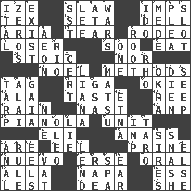 ACROSS 1. Ending with capital 4. Cole _ (cabbage dish) 8. Naughty children 12. John Ritter's dad 13. Bristle 14. Small valley 15. Roberta Peters solo 17. Lacerate 18. Cowboy competition 19. Failure 21. "Barney Miller" actor Jack 23. Erode 24. Unemotional 26. Not either 28. Christmas carol 30. Modes 34. Label 37. Capital of Latvia 39. Migrant worker of the '30s 40. Chicken ___ king 41. Clothes sense 43. To riddle 44. Water falling in drops from the sky 46. Political cartoonist Thomas 47. Electrical Unit 48. Player piano 51. A single undivided whole 54. Biblical high priest 55. Collect or gather 58. "We ___ not amused" (Victoria) 61. Snakelike fish 63. A-one 65. New (sp.) 67. Celtic language 71. Spoken 72. Silent film actress Nazimova 73. California wine valley 74. Curvy letter 75. For fear that 76. Letter starter 77. A female animal or person DOWN 1. Slanted text style (abbr.) 2. Nothings 3. Be extant 4. Fast jet (abbr.) 5. Area sheltered from the wind 6. _ moment's notice (2 wds.) 7. Armed conflicts 8. Wedding promise 9. Ancient Persian 10. Entreaty 11. Slit 16. Period of immesurable duration 18. Carrot, for example 20. _ de Janeiro 22. Single 25. Sure thing 27. 17th letter of the Greek alphabet 29. Climbing, woody, usually tropical vines 30. Taiwanese island in East China Sea 31. Gumbo ingredient 32. South Vietnam president (1954) 33. Ooze 34. Canvas cover 35. Mountain range southwest of Kyrgyzstan 36. Greek goddess of the earth (variant) 38. Girls' org. (abbr.) 42. Inactive volcano in Sicily 45. Compass dir. 49. Butter sub 50. Whopper 52. Naughty child 53. Edible starchy tuberous root 56. Titles for men of rank and authority 57. Box-office sellout 58. Of or related to the anus 59. Court order 60. Snakelike fish 62. Grant temporary use of 64. Otherwise 66. Large container 68. Actress Charlotte 69. Health resort 70. Hearing organ