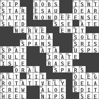 ACROSS 1. Small drink 4. Moves up and down 8. Is not 12. Play the lead 14. He sold his birthright 15. Letter starter 16. Jacques of French films 17. Unrelated to defense, as in spending 20. Downhill vehicle 21. Compass dir. 22. Had dinner 23. Impudent aggressiveness 27. Give off 29. Opera by Verdi 31. Not divided or shared with others 34. Connects, as a bridge 35. Indian titles of respect 36. Petty quarrel 39. "One Day ___ Time" 41. United States Postal Service (abbr.) 42. General guideline 43. Feeling or showing extreme anger 46. Small island 47. To erase 48. Relating to the mouth 51. Practice fights 54. The first octave above the treble staff 56. One more than two 58. Cassini of fashion 61. Producing rotation 66. Actor Lugosi 67. Group working together 68. _ vera 69. Prepare for publication 70. The bottom of a shoe or boot 71. Cuts off 72. Perceive with the eye DOWN 1. Fast planes 2. Slanted text style (abbr.) 3. Eucharist need 4. Benjamin's nick name 5. Bear (Spanish) 6. Forbid 7. Beer foam 8. Binary compound 9. Elected representatives 10. Political cartoonist Thomas 11. Family _ (genealogy) 13. Travel on an animal 18. Compass dir. 19. Opposite of masc. 24. Reproach for some lapse or misdeed 25. By way of 26. Pulitzer Prize-winning author Ferber 28. Come out of 30. Moving or stirring 32. Mouth edge 33. Curvy letter 34. Navigate 36. Indian title of respect (Mr.) 37. Purulenc 38. One to whom something is allotted 40. Ancient river in northeast Turkey 44. Cleo's killer 45. Afternoon social gathering 49. Small island 50. Cards in a Roman deck? 52. Loose flowing garment 53. Bobsleighs 54. Bowlike part 55. Old wives' tales, e.g. 57. _ the terrible 59. Writer Wiesel 60. Yard entry 62. Leather borer 63. Connecticut Ivy Leaguer 64. Chop off 65. Consenting reply