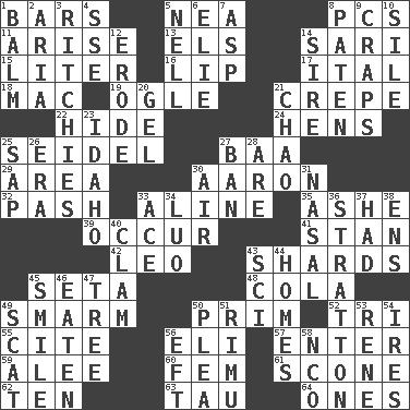 ACROSS 1. Long, evenly shaped pieces 5. Teachers' org. 8. Personal Computers (abbr.) 11. Ascend 13. Raised railways 14. Indian skirt 15. 61 cubic inches 16. Mouth edge 17. Slanted text style (abbr.) 18. Big _ 19. Stare 21. Streamer paper 22. Flintstone garb 24. Coop moms 25. A glass for beer 27. Sound made by sheep 29. Type of rug 30. Composer Copland 32. Romantic infatuation 33. Place in a line 35. American tennis player Robert 39. Happen 41. Comedian Laurel of Laurel & Hardy 42. Lion 43. Broken pieces 45. Stalk of a moss capsule 48. Root beer relative 49. Excessive but superficial compliments 50. Demure 52. Three (prefix) 55. Quote 56. Biblical high priest 57. Keyboard key 59. Toward shelter 60. Opposite of masc. 61. Biscuitlike quick bread 62. "___ Little Indians" 63. The 19th letter of the Greek alphabet 64. Washington bills DOWN 1. Lip ointment 2. Roberta Peters solo 3. Actors Guy, Robert Welles, and Clint 4. Compass dir. 5. 1994 drama film starring Jodie Foster 6. Writer Wiesel 7. Cleo's killer 8. Eucharist need 9. Dice game 10. Drop; flow; fall 12. Eat (away) 14. Beget 20. Set 21. US Secretary of Labor Elaine L. _ 23. Potato state 25. Plant excrement 26. Epoch 27. Bar 28. "We ___ not amused" (Victoria) 30. Atmosphere 31. Relating to the nose 33. Adept person 34. Nilotic language 36. Ski resort town in Vermont 37. Possessed 38. Followers of ems 40. Burrowing marine mollusk 43. _-fi 44. Residences 45. Grin 46. Consumed 47. Family _ (genealogy) 49. Get outta here! 50. Entreaty 51. Tall New Zealand timber tree 53. French philosopher Descartes 54. Angers 56. Bank Draft (abbr.) 58. Non-commissioned officer (abbr.)