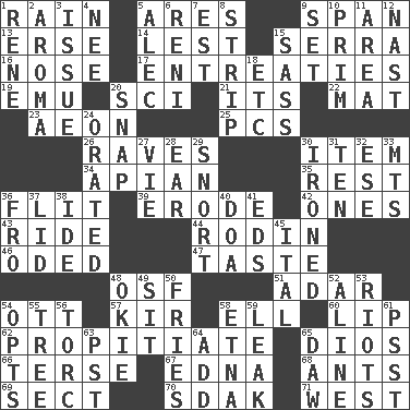 ACROSS 1. Precipitation 5. Ancient Greek god of war 9. Connect, as a bridge 13. Celtic language 14. For fear that 15. Father Junipero _ 16. Sense of smell 17. Pleas 19. Australian flightless bird 20. _-fi 21. ___ a Wonderful Life 22. Floor protector 23. Period of immesurable duration 25. Personal Computers (abbr.) 26. All-night dance parties 30. Detail 34. Bee-related 35. Take ten 36. Secret move to avoid paying debts 39. Wear away 42. Washington bills 43. Travel on an animal 44. "The Thinker" sculptor 46. Wrote a lyric poem 47. Clothes sense 48. Order of Saint Francis (abbr.) 51. The sixth month of the Jewish calendar 54. Baseball player Mel 57. Apertif with cassis 58. Pipe bend 60. Mouth edge 62. Appease 65. "Vaya con ____" 66. Laconic 67. Pulitzer Prize-winning author Ferber 68. Pismires 69. Religious group 70. Neighbor of Neb. 71. Compass direction DOWN 1. French philosopher Descartes 2. Scent 3. Come out of 4. Born 5. Actor Baldwin 6. Painter Guido (1575-1642) 7. Eastern Standard Time (abbr.) 8. Remove all contents or possession from 9. Arrange properly for use 10. Demure 11. Type of rug 12. Political cartoonist Thomas 15. Backtalk 18. And so on (abbr.) 20. Fastener 24. Declaimed 27. Compete 28. Hearing organ 29. Derisive sound 30. Pressed 31. Nine, plus one 32. Compass dir. 33. Mountains (abbr.) 36. Back 37. Hat (slang) 38. Binary compound 40. ___ good deed 41. Begley and Asner 45. Slanted text style (abbr.) 48. Migrant worker of the '30s 49. Be seated 50. Strips of potato fried in deep fat 52. Place in a line 53. Debaucheries 54. Elects 55. Woody plant 56. Torque (variant) 58. Inactive volcano in Sicily 59. Path through which fluid escapes 61. Inconspicuous attention getter 63. Pacific Standard Time (abbr.) 64. Increase 65. Fool
