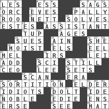 ACROSS 1. French article 4. Curvy letter 7. Sinks 11. The grampus (Milton) 12. Nights before holidays 13. Chummy 14. Friend of Pooh 15. Remaining after all deductions 16. Finds the solution 17. _____ Park, CO 19. Aide 21. Uncastrated adult male sheep 23. Eons 24. Takes to court 25. The 18th letter of the Arabic alphabet 26. A female animal or person 29. Wet 30. Raised railways 31. Snakelike fish 32. Cartoonist voice _ Blanc 33. Big collection agency 34. Flowery wreath 35. Increase 36. _-fi 37. Free from disturbance or agitation 40. Corporate head (abbr.) 41. Area sheltered from the wind 42. Puts into a specified state 43. Glance over 45. Period 46. Making a chance decision by using lots 51. A person who is older than you are 55. Foolish or stupid persons 56. Stupid person 58. Binary compound 59. Impressive in appearance 60. Singer Brickell 61. Followers of ems 62. Celtic language 63. Perceive with the eye 64. Floor covering DOWN 1. Old wives' tales, e.g. 2. Greek god of love 3. Highlander 4. Night before a holiday 5. Bristle 6. Fast planes 7. Table seasonings 8. Inventor's middle name 9. Small, secluded valley 10. System (abbr.) 12. Follows as a consequence or result 13. Airs 16. Attaches a signature 18. Needle case 20. Travel by water 22. Pacific Standard Time (abbr.) 24. Twentieth part of a lira 25. Nest on high 26. Makes a sale 27. The bottom of a shoe or boot 28. Biblical high priest 29. Ancient Persian 32. Apple computer (short form) 33. Ancient Celtic tribe of eastern Britain 36. Narrow boards 37. Compass dir. 38. Cigar-shaped 39. Slanted text style (abbr.) 43. Fur scarf 44. Quote 46. Trig term 47. Scent 48. Teases 49. Lyric poems 50. Connecting point 52. South Vietnam president (1954) 53. Pulitzer Prize-winning author Ferber 54. Repose 57. Falsehood