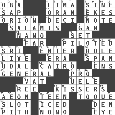 ACROSS 1. Chief or king in Benin or Nigeria 4. Pale green bean 8. Trig term 12. Plant excrement 13. NW Algerian seaport 14. Supplements with great effort 15. Greek mythologigal hunter 18. Tenth: prefix 19. Observe 20. Deli grouping 22. Separate the seeds from cotton 23. Billionth: prefix 24. Arrange properly for use 25. Distant 26. Manned the helm 30. Indian title of respect (Mr.) 33. Keyboard key 36. Hero or heavy, e.g. 37. Not recorded 39. Period 40. Connect, as a bridge 41. Hereditary estate 42. Capital of Egypt 44. Followers of ems 45. Commissioned military rank 47. Adept person 50. Large container 51. Ubangi River tributary 53. To riddle 54. Smoochers 57. Age 59. Adolescent 61. Woman's close-fitting hat 63. Narrow, elongated depression 64. On the rocks 65. Lair 66. Essential or central part 67. Words to Nanette 68. Sight organ DOWN 1. Bear (Spanish) 2. Oblong pieces of solid material 3. Bee-related 4. Farming town in central California 5. Angers 6. Big _ 7. Black tropical American cuckoo 8. Elected representatives 9. Picture 10. Fish or hair follower 11. Compass dir. 16. Norwegian king 17. Nanny 21. Greater amount 22. Set 24. Title for a knight 26. Lightbulb-shaped fruit 27. Drink excessively 28. Flair 29. Habitations of wild animals 30. Snaillike creature with no shell 31. Travel on or in a vehicle 32. _ the terrible 34. Actress Patricia 35. Three (prefix) 38. Veterans Day date 42. Feline 43. Musical composition 46. Actress Charlotte 48. Repose 49. Butter sub 52. Wear away 53. Carrot, for example 54. Peachy ____! 55. Southeast Asian peninsula 56. Chop _ 57. Viper 58. Connecticut Ivy Leaguer 59. Shallow baking pan 60. Environmental prefix 62. Compass dir.