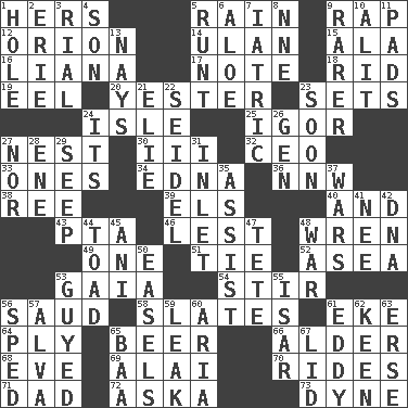 ACROSS 1. Possessive pronoun 5. Precipitation 9. Strike 12. Greek mythologigal hunter 14. Uhlan (variant) 15. Wing 16. Woody, climbing, usually tropical plant 17. Musical sound 18. To free from 19. Snakelike fish 20. Last past 23. Arranges properly for use 24. Small island 25. Composer Stravinsky 27. A home for chicks 30. One more than two 32. Corporate head (abbr.) 33. Singles 34. Pulitzer Prize-winning author Ferber 36. Compass dir. 38. To riddle 39. Raised railways 40. Also 43. Parent Teacher Assoc. 46. For fear that 48. Songbird 49. Single 51. Make a knot 52. At sea 53. Greek goddess of the earth (variant) 54. Agitate 56. Saudi Arabian king (1953-1964) 58. Chalkboards 61. Supplement with great effort 64. Strand of rope, yarn or thread 65. Fermented drink made from hops 66. Tree or shrub in the Birch family 68. First lady 69. Jai ____ 70. Amusement-park features 71. Male parent 72. "____ silly question..." 73. Unit of force DOWN 1. Hollow 2. 4th largest of the Great Lakes 3. Monetary unit of Yemen 4. Male child 5. Undersized animal 6. _ vera 7. Of or pertaining to medicine 8. Compass dir. 9. More valued for its uncommonness 10. Set down 11. Writing tablets 13. Negative votes 21. Writer Wiesel 22. Beer mug 23. Within a short period 24. ___ a Wonderful Life 26. Commissioned mil. rank 27. Or not 28. Compass dir. 29. Ooze 31. An arm off of a larger body of water 35. Aid 37. Armed conflicts 41. Born 42. Heredity factor (abbr.) 44. Frog relative 45. Cuckoo 47. Wig 48. Armed conflict 50. Artist's stands 53. Steadied 55. Austrian river, tributary to the Danube 56. Hurried 57. Inventor's middle name 59. Path through which fluid escapes 60. Operatic vocal solo 61. Whirlpool 62. Peachy ____! 63. Celtic language 65. Sound made by sheep 67. Flaplike covering