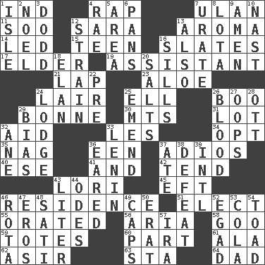 ACROSS 1. Working for oneself (abbr.) 4. Reproach for some lapse or misdeed 7. Uhlan (variant) 11. "Barney Miller" actor Jack 12. "Two Mules for Sister ____" 13. Odor 14. Directed 15. Adolescent 16. Chalkboards 17. A person who is older than you are 19. Helper 21. Pet locale 23. Medicinal plant 24. Den 25. Pipe bend 26. Sometimes accompanies a hiss 29. Child's nurse 30. Mountains (abbr.) 31. Car dealer's back yard 32. Help 33. French article 34. Choose 35. Tired old horse 36. Car or cant ending 37. Goodbye (Sp.) 40. Compass dir. 41. Added to 42. Be inclined (to) 43. Australian parrot (variant) 45. Lizard (obsolete) 46. Dwelling 51. Choose 55. Declaimed 56. Roberta Peters solo 58. Thick or sticky substance 59. Hauls 60. Role in a play 61. In the manner of 62. SW Saudi Arabia district 63. R.R. building 64. June honoree DOWN 1. Capri or Wright 2. Christmas carol 3. Texas town _ City 4. Actress Charlotte 5. Type of rug 6. Zero-star reviews 7. A salt of uric acid 8. Globular water bottle used in Asia 9. So be it 10. Political cartoonist Thomas 12. Put through a sieve 13. In addition 16. Beverly of Met fame 18. Liveliness 20. Table seasonings 22. Before (prefix) 24. Cabin 25. Make improvements or corrections to 26. Vital fluid 27. I made a mistake 28. Baseball player Mel 29. Prejudice 32. One (Scot) 33. Soviet premier 1918-24 36. Having ears or earlike features 37. Had dinner 38. Outscore 39. International (abbr.) 43. 61 cubic inches 44. Lyric poems 46. Round or rotation of duties 47. Greek god of love 48. Suttee (variant) 49. Balmoral and tarboosh 50. Part of Q.E.F. 52. Mild oath 53. Root beer relative 54. Frog relative 57. Retirement account (abbr.)