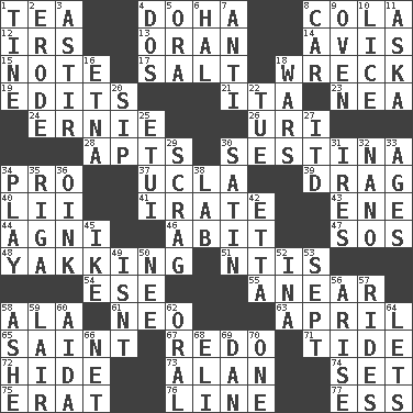 ACROSS 1. Beverage made from leaves 4. Capital of the state of Qatar 8. Root beer relative 12. Big collection agency 13. NW Algerian seaport 14. Deliberation 15. Observe 17. Table seasoning 18. Raze 19. Prepares for publication 21. Call ___ day 23. Teachers' org. 24. Bert's buddy 26. RI univ. 28. Flats, for short 30. French poetic form 34. Adept person 37. Southern CA. univ. 39. To trail on the ground 40. Cards in a Roman deck? 41. Feeling or showing extreme anger 43. Compass dir. 44. Hindu god of fire 46. "This won't hurt ____!" 47. Mayday 48. Prolonged, sometimes senseless talking 51. Nuclear Threat Initiatives 54. Compass dir. 55. Approach 58. Wing 61. Modern: prefix 63. Showery time 65. Virtuous person 67. Redecorate 71. Event that recurs at intervals 72. Flintstone garb 73. Actor Alda or Thicke 74. Arrange properly for use 75. Part of Q.E.F. 76. Actor's bit 77. Double-curved letter DOWN 1. Prong on a fork 2. Eat (away) 3. Having gotten out of bed 4. Two (Sp.) 5. Mouth or opening 6. Actor Linden 7. Against 8. Automobile 9. Baking chamber 10. Louse (plural) 11. "____ silly question..." 16. Inactive volcano in Sicily 18. Armed conflicts 20. Small drink 22. Third day of the wk. 25. Needle holder 27. It would 29. Lean end of the neck 30. Smooth fabric 31. Angers 32. Billionth: prefix 33. Ripens 34. Shaw product 35. Port city in Latvia 36. Pig sound 38. Experiment locale 42. Singer James 45. Eisenhower's nickname 49. Is not 50. Born 52. _ tizzy (2 wds.) 53. Back-to-school mo. 56. Originate 57. Amusement-park features 58. American tennis player Robert 59. Den 60. Opera by Verdi 62. Taken by mouth 64. Allows 66. Fish or hair follower 68. Connecticut Ivy Leaguer 69. Daniel's nick name 70. Single