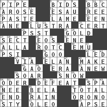 ACROSS 1. Corncob 5. Auction offers 9. English channel? 12. Came up 14. Son of Isaac 15. Portuguese money of account (variant) 16. Thick mixture 17. Unable to walk 18. Car or cant ending 19. One (Scot) 20. A period of five years 23. An absolute certainty 24. Inconspicuous attention getter 25. Gilt 27. Religious group 30. Greek goddess of the dawn 32. Compass dir. 33. Silent film actress Nazimova 34. College mil. group 36. Australian flightless bird 38. Air pressure measure (abbr.) 39. Thick or sticky substance 40. Directed 43. By way of 46. Style 48. Cause to be 49. E Mali city 51. Period 52. Afresh 53. Fly high 54. Overwhelm 56. River in Europe 58. Outscore 61. Health resort 64. Born 65. Actor Lugosi 66. Add up to 68. Conclusion 69. Water falling in drops from the sky 70. U. of Maine site 71. Filthy place 72. Margarine 73. Domed church section DOWN 1. Dad 2. SW Asia republic 3. Airs 4. Eastern Standard Time (abbr.) 5. Waist strap 6. Austrian river, tributary to the Danube 7. Break 8. Institute legal proceedings 9. A special lineage 10. Fermented drink made from hops 11. Penny 13. Snakelike fish 21. One who makes use of a thing 22. Moe Howard, for one 23. Clement's nick name 24. Parent Teacher Assoc. 26. Single 27. Plant excrement 28. Raised railways 29. 154 in Roman numerals 31. Fur scarf 35. Unrefined 37. Uhlan (variant) 41. Make supply last 42. Morning condensation 44. Russian composer Stravinsky 45. American Automobile Association (abbr.) 47. Nanny 48. Informal term for the mouth 50. Severe or trying experience 53. Full of seeds 55. "Beetle Bailey" pooch 56. Singles 57. Gouge 59. Writer Wiesel 60. Papal veil 61. Close up, plug up 62. Zero-star reviews 63. _ vera 65. Sis' sibling 67. Mouth or opening