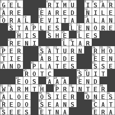 ACROSS 1. Set 4. Tall New Zealand timber tree 8. Austrian river, tributary to the Danube 12. "We ___ not amused" (Victoria) 13. Having ears or earlike features 14. Mediterranean tributary 15. Of the mouth 17. Webber/Rice musical 18. Actor Alda or Thicke 19. Paper fasteners 21. Poe poem 23. Part of HMS, perhaps 24. A female animal or person 26. French article 27. Painter Guido (1575-1642) 28. One who doesn't tell the truth 30. For each 31. Titan orbits this 34. 17th letter of the Greek alphabet 37. Neckwear 38. Tolerate 39. Car or cant ending 40. Added to 41. Food holders 42. Compass dir. 43. College mil. group 44. Set of matching outer garments 46. Greek goddess of the dawn 47. American Automobile Association (abbr.) 50. Conclusion 51. Heat 54. Hard copy producer 57. Medicinal plant 58. Flexible twig of a willow tree 60. Washington bills 62. Redecorate 63. Actors Connery and Penn 64. Domesticated feline 65. Observes 66. Inactive volcano in Sicily 67. Epoch DOWN 1. E Mali city 2. Blunders 3. Tough but pliablecoriaceous 4. All-night dance parties 5. From or relating to Ireland 6. Was introduced to 7. Allodial 8. More empty; more void 9. Grain storage towers 10. Having or resembling wings 11. French philosopher Descartes 13. Snakelike fish 16. (Had) reclined 20. Air pressure measure (abbr.) 22. Liveliness 25. Evade 27. It's straight from the horse's mouth 29. Angers 30. Parent Teacher Assoc. 31. Table seasoning 32. Phillipine bananalike plant 33. Teat (slang) 34. Dwelling 35. Command 36. Single 41. Mail 43. Lover boys 44. Elected rep. 45. To (old English) 46. Eat (away) 48. Bee-related 49. Sports stadium 51. Armed conflicts 52. Toward shelter 53. Flexible conduit 55. Big collection agency 56. Tail end 59. Arrange properly for use 61. R.R. building